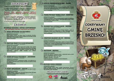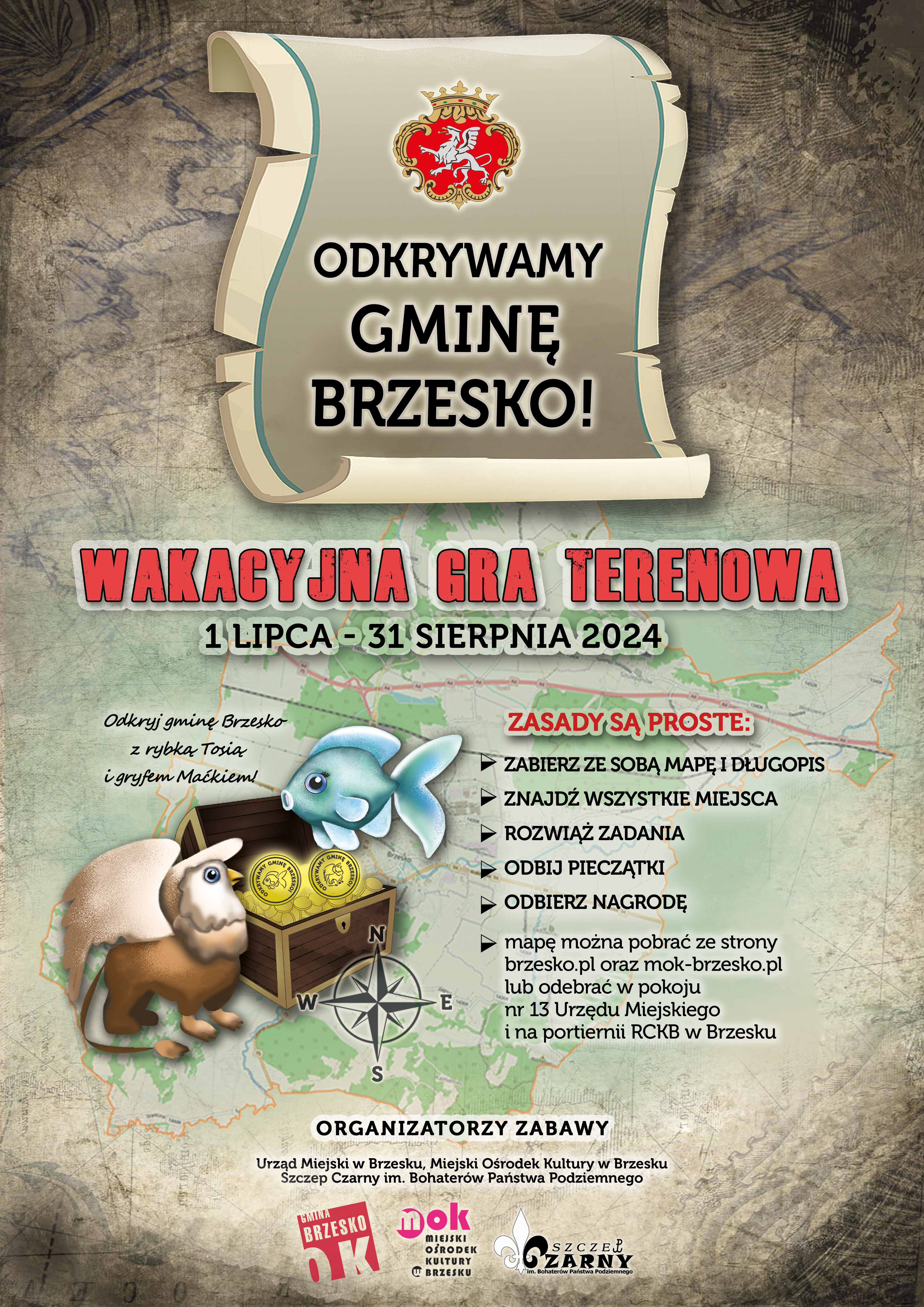 Burmistrz Brzeska Tomasz Latocha, Urząd Miejski w Brzesku, Miejski Ośrodek Kultury oraz Szczep Czarny im. Bohaterów Państwa Podziemnego zapraszają dzieci, młodzież i dorosłych do udziału w Wakacyjnej Grze Terenowej „ODKRYWAMY GMINĘ BRZESKO”, która trwać będzie od 1 lipca do 31 sierpnia br.