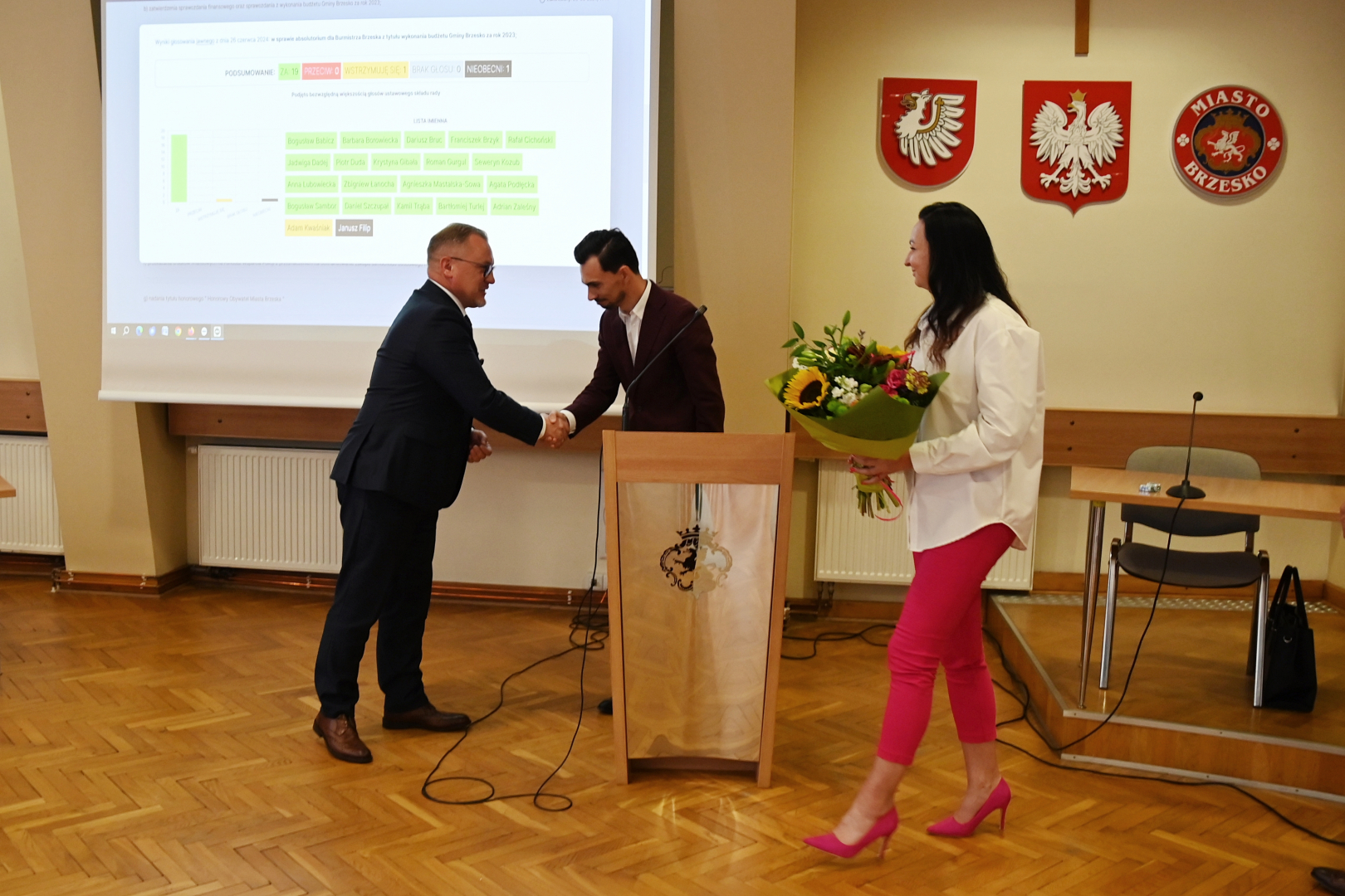 Po podliczeniu głosów na sali obrad rozległy się oklaski. W imieniu radnych gratulacje złożył burmistrzowi Adrian Zaleśny. Przewodniczący Rady Miejskiej w krótkim przemówieniu podziękował włodarzowi Brzeska za ogrom pracy w rozwój całej gminy. Życzył też dalszych sukcesów w realizacji nowych zadań, które zostaną uchwalone w obecnej kadencji.
