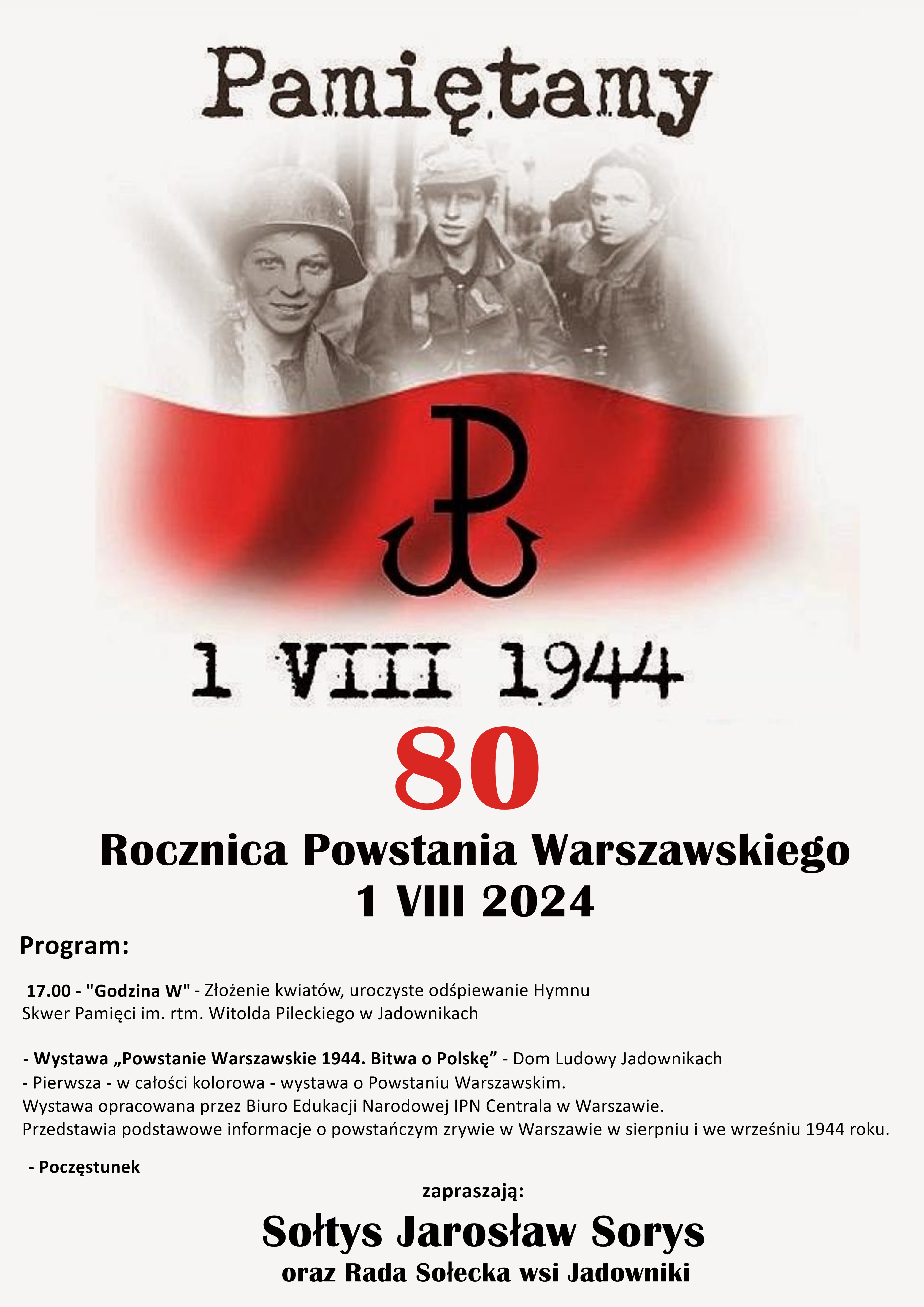 Jak co roku serdecznie zapraszamy do upamiętnienia powstańców warszawskich. Rokrocznie Sołtys wsi Jadowniki Jarosław Sorys wspólnie z Radą Sołecką oraz mieszkańcami Jadownik upamiętnią heroiczną walkę o wolność! Serdecznie zapraszamy wszystkich mieszkańców gminy Brzesko na skwer im. rtm. Witolda Pileckiego w Jadownikach. Początek o godz. 17.00 Warto dodać, że wśród ofiar były również osoby pochodzące z naszej Gminy, m.in. Jadowniczanin, redemptorysta Jan Świerczek.