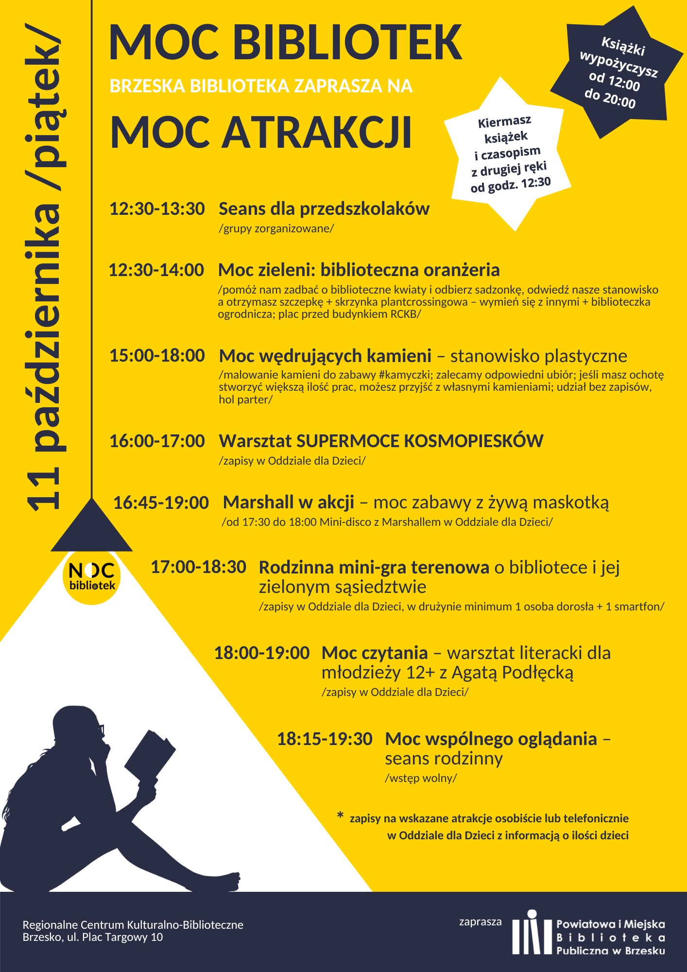 Brzeska biblioteka zaprasza na event w ramach Nocy Bibliotek pełen atrakcji dla całej rodziny – czekają warsztaty, gra, stanowiska tematyczne, spotkanie z żywą maskotką, seanse filmowe, kiermasz książek i czasopism z drugiej ręki. Zgodnie z hasłem tegorocznej edycji wszystkie wydarzenia będą miały MOC – zabawy, zwłaszcza dla najmłodszych, ale też i żywiołów – na stanowisku wymiany roślin oraz malowania kamieni. Na część zajęć obowiązują zapisy, szczegóły na plakacie.