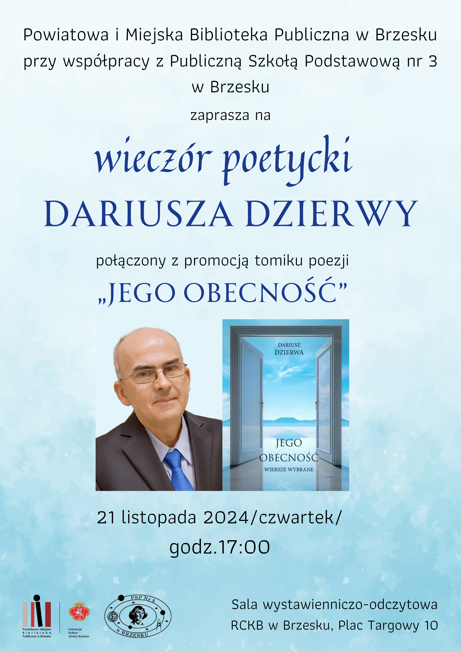 Brzeska biblioteka we współpracy z Publiczną Szkołą Podstawową nr 3 w Brzesku zaprasza na wieczór poetycki brzeszczanina, Dariusza Dzierwy, podczas którego promowany będzie wydany w tym roku tomik „Jego obecność”. Wiersze autora zaprezentują dzieci z PSP nr 3. Podczas spotkania będzie możliwość otrzymania egzemplarza publikacji.