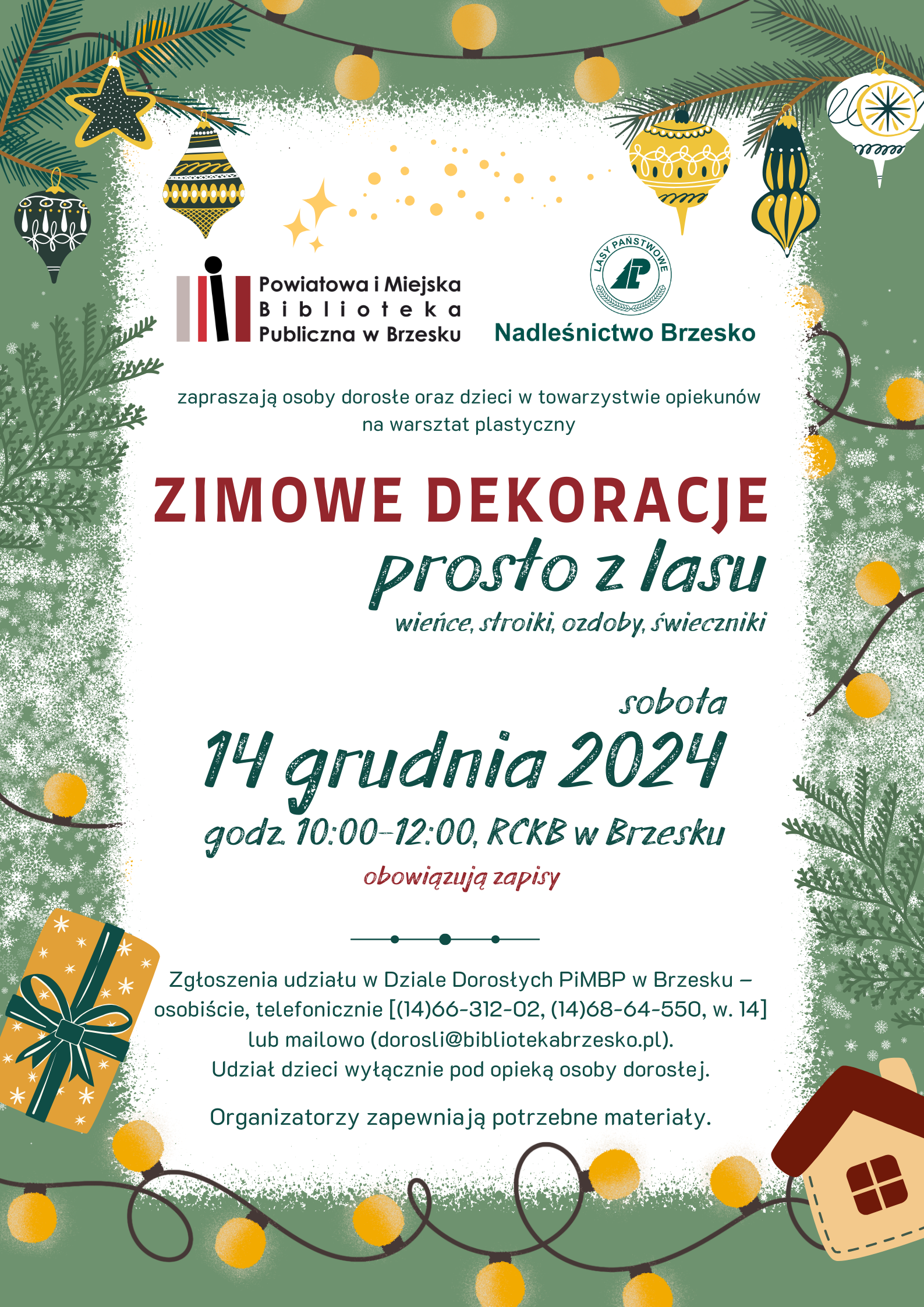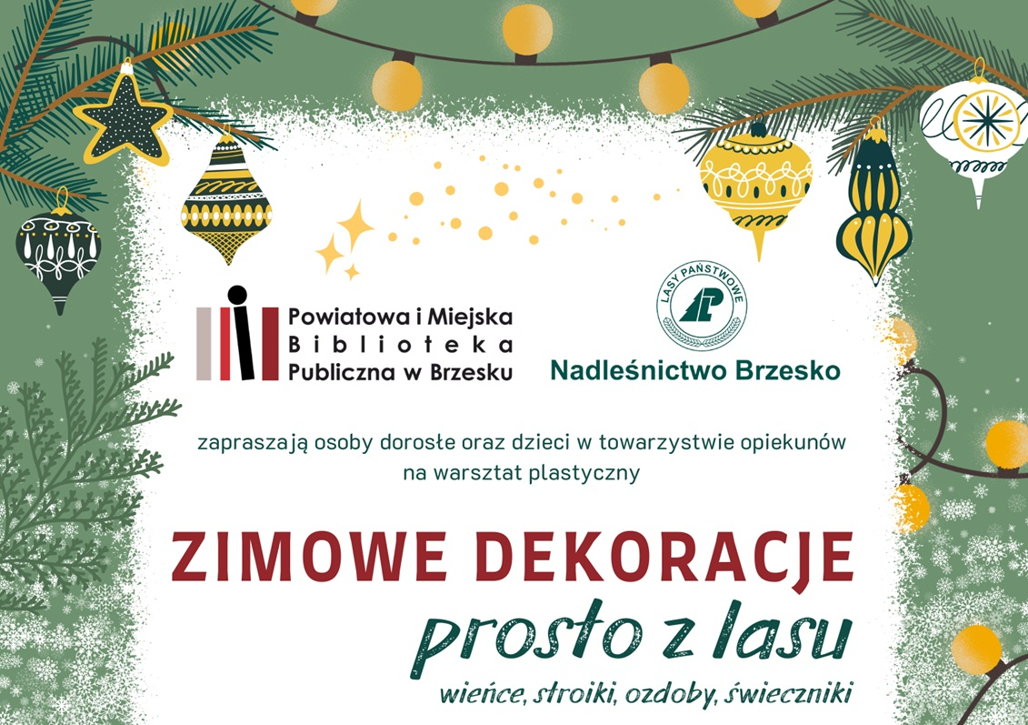 Brzeska biblioteka oraz Nadleśnictwo Brzesko zapraszają na warsztaty zimowych dekoracji i ozdób świątecznych. Ich motywem przewodnim będzie las, wykonamy wieńce, stroiki, świeczniki. Organizatorzy zapewniają materiały. Udział bezpłatny po wcześniejszym zapisie.