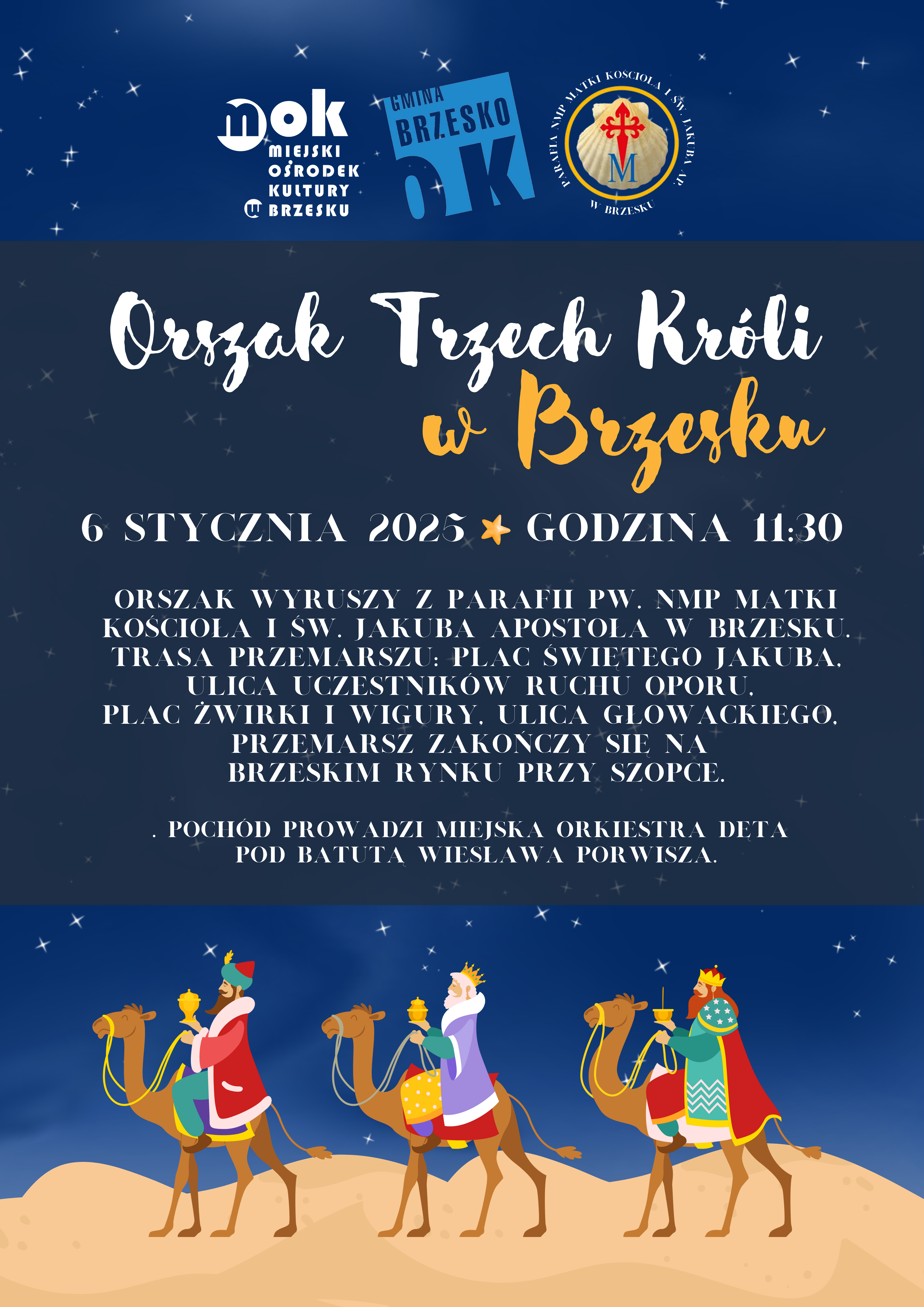 6 stycznia ulicami miasta przejdzie po raz kolejny Orszak Trzech Króli, który wyruszy o godzinie 11:30 spod kościoła św. Jakuba Apostoła i ulicą Uczestników Ruchu Oporu, poprzez plac Żwirki i Wigury, ulicą Głowackiego dotrze na brzeski Rynek, gdzie zakończy swój przemarsz przy szopce. Do uczestnictwa w orszaku serdecznie zaprasza burmistrz Brzeska Tomasz Latocha.