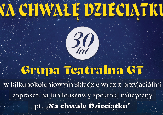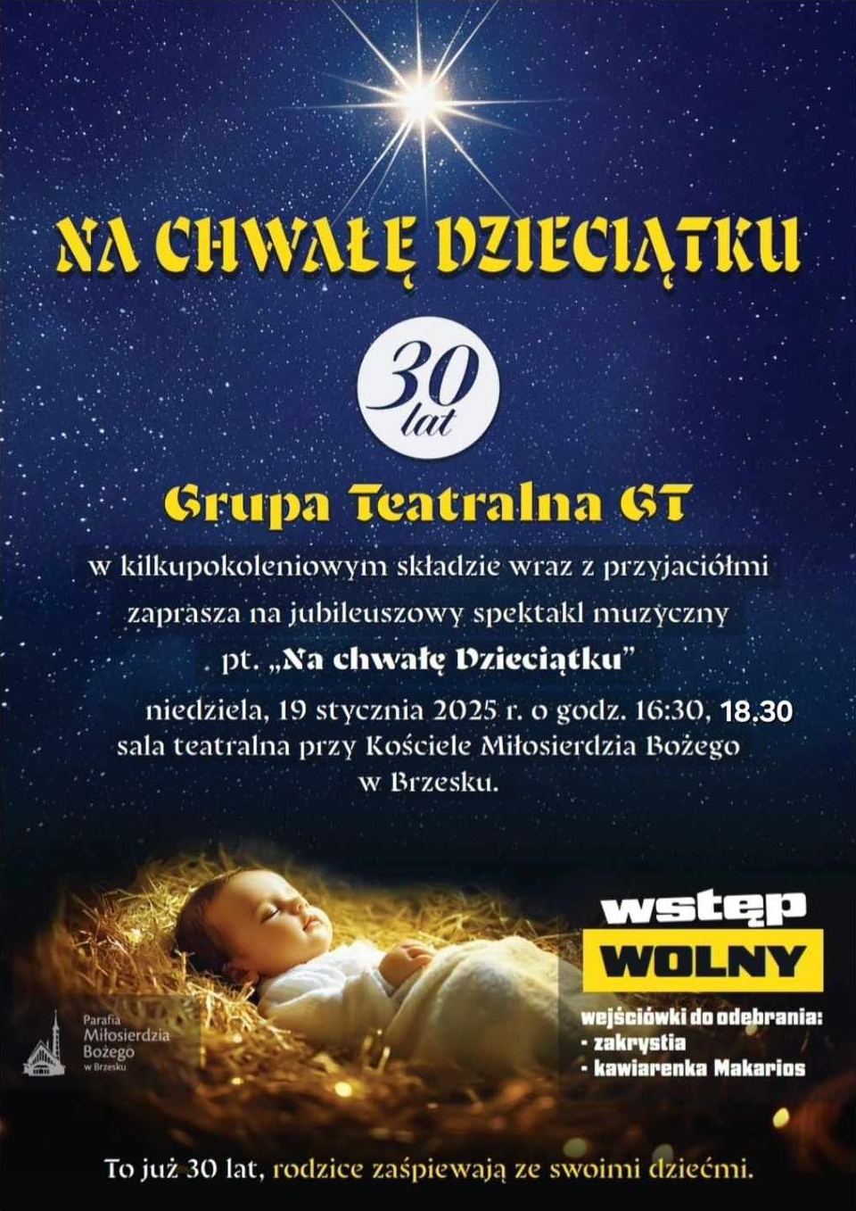 Grupa Teatralna GT świętująca 30-lecie swej działalności w kilkupokoleniowym składzie wraz z przyjaciołmi zaprasza na jubileuszowy spektakl muzyczny pt. "Na chwałę Dzieciątku" w niedzielę 19 stycznia 2025 r. o godz. 16:30 i 18.30 do sali teatralnej przy Kościele Miłosierdzia Bożego w Brzesku. Rodzice wystąpią ze swoimi dziećmi. Wejściówki do odbioru w zakrystii kościoła , w kawiarence Makarios, a na 18:30 dodatkowo przed samym występem.