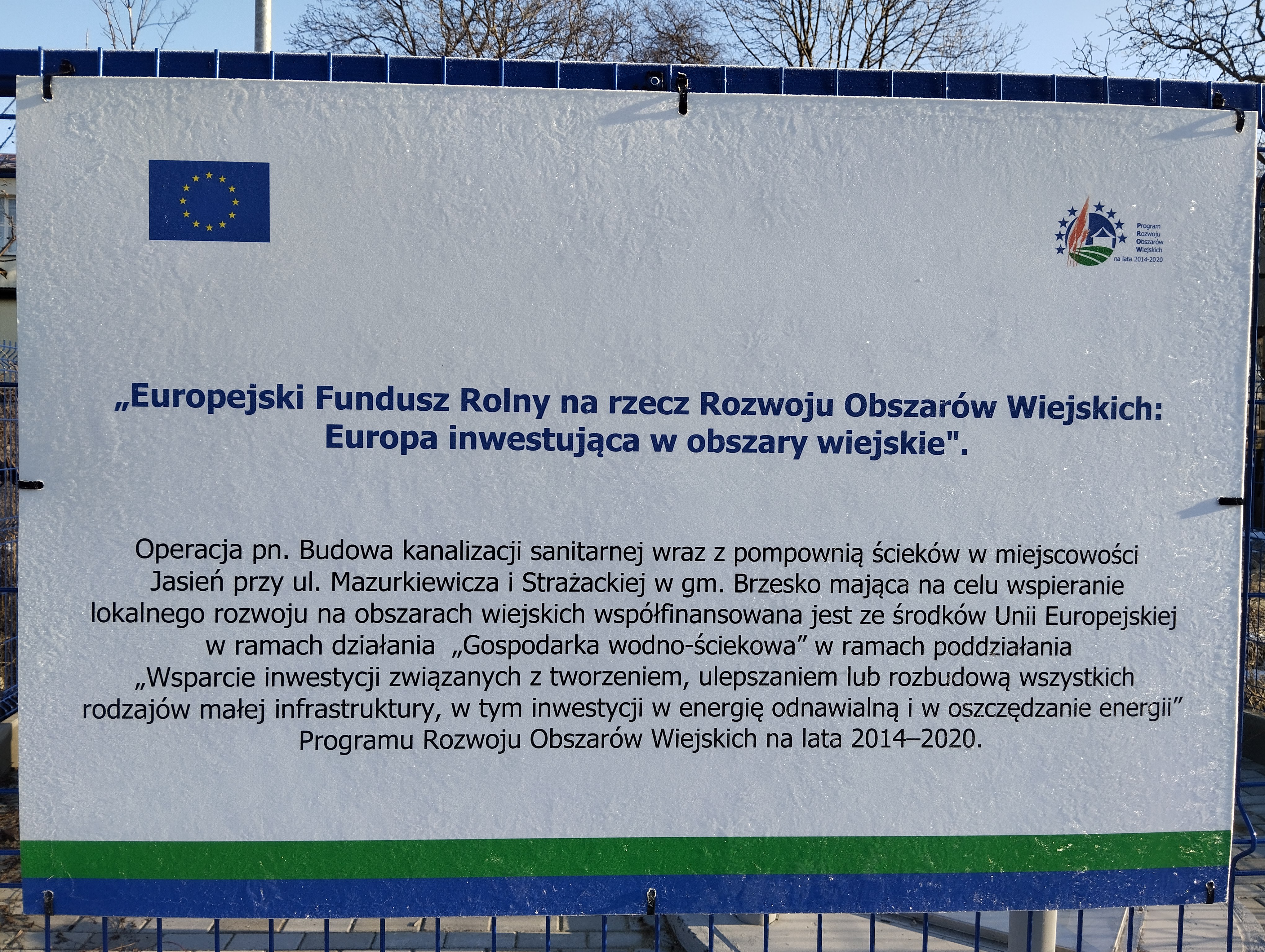 Dzięki staraniom brzeskiego samorządu w niecałe półtora roku wzdłuż ulic Księdza Mazurkiewicza i Strażackiej w Jasieniu powstał ponad 2-kilometrowy odcinek sieci kanalizacyjnej wraz z pompownią ścieków. Cała inwestycja realizowana była od lipca 2023 roku do grudnia 2024 roku, z dwumiesięczną przerwą.