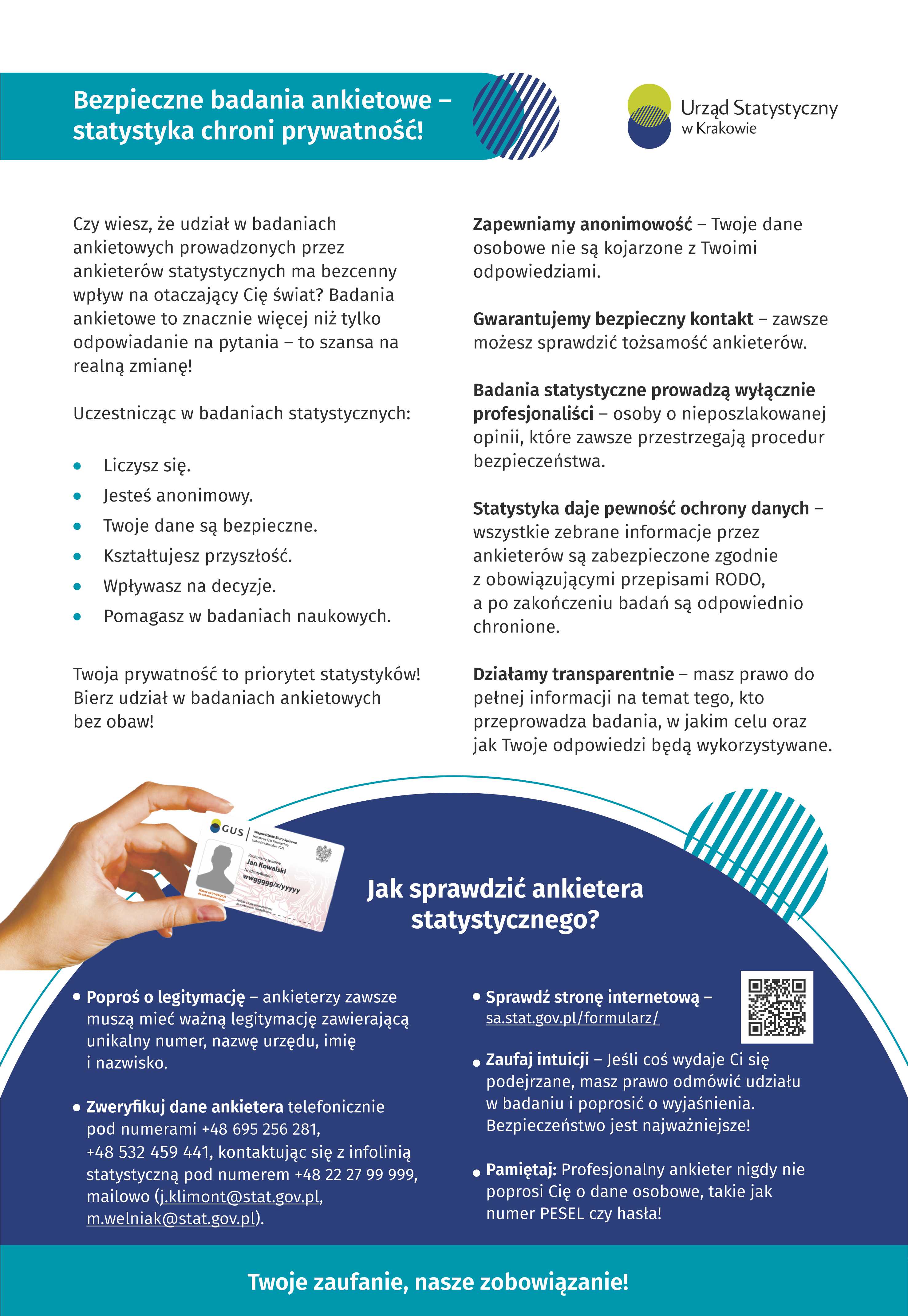 - Zweryfikuj dane ankietera telefonicznie pod numerami +48 695 256 281, +48 532 459 441, kontaktując się z infolinią statystyczną pod numerem +48 22 27 99 999, mailowo (j.klimont@stat.gov.pl, m.welniak@stat.gov.pl).
