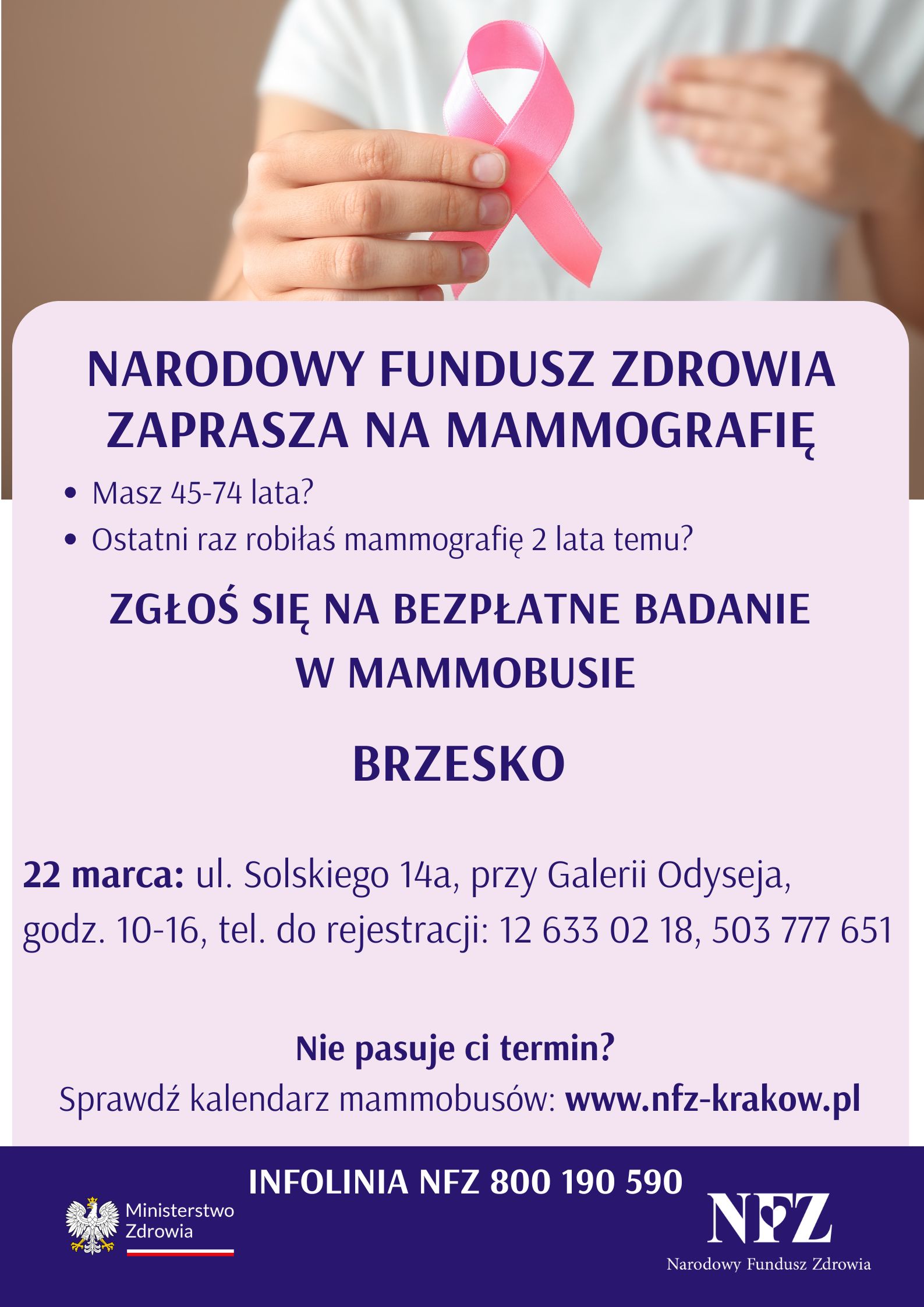 Narodowy Fundusz Zdrowia zaprasza mieszkanki powiatu brzeskiego na mammografię. W programie profilaktyki raka piersi bezpłatnie, raz na dwa lata, mogą zbadać się panie w wieku 45-74 lata. Badania są wykonywane w pracowniach stacjonarnych i w mammobusach. W Brzesku - 22 marca 2025 r.
