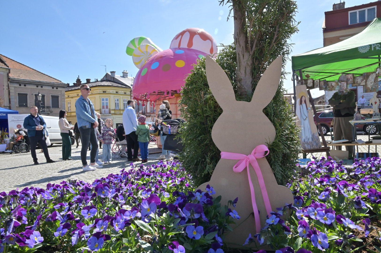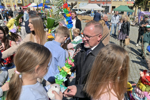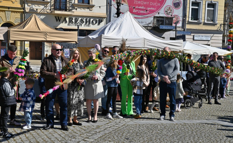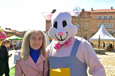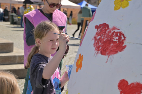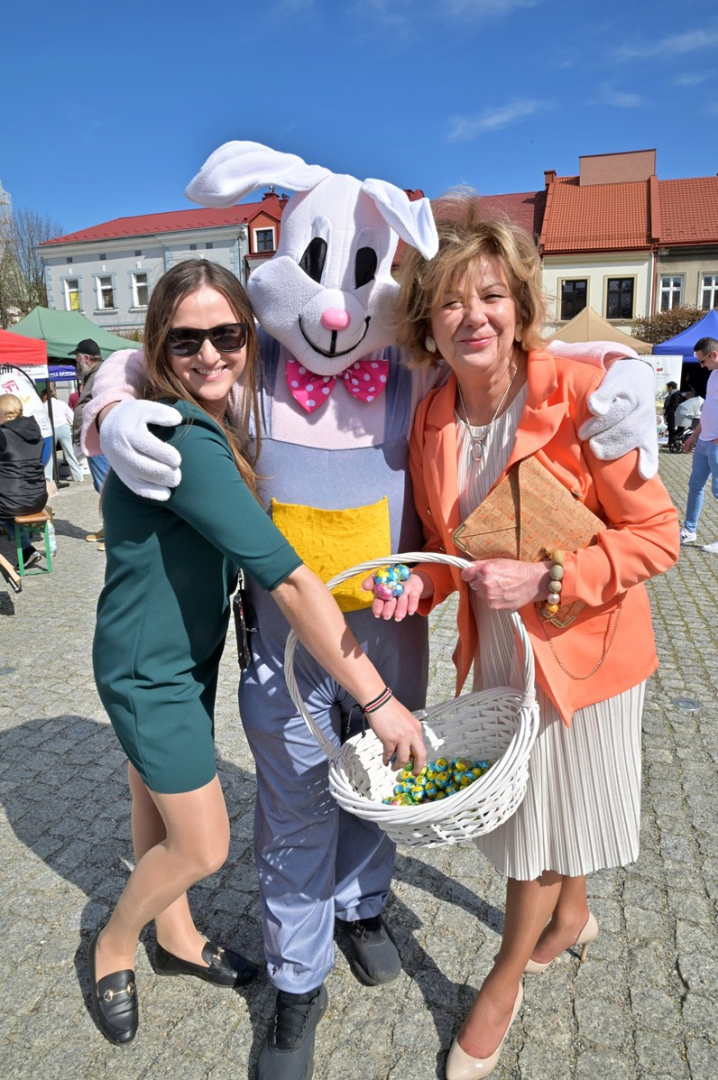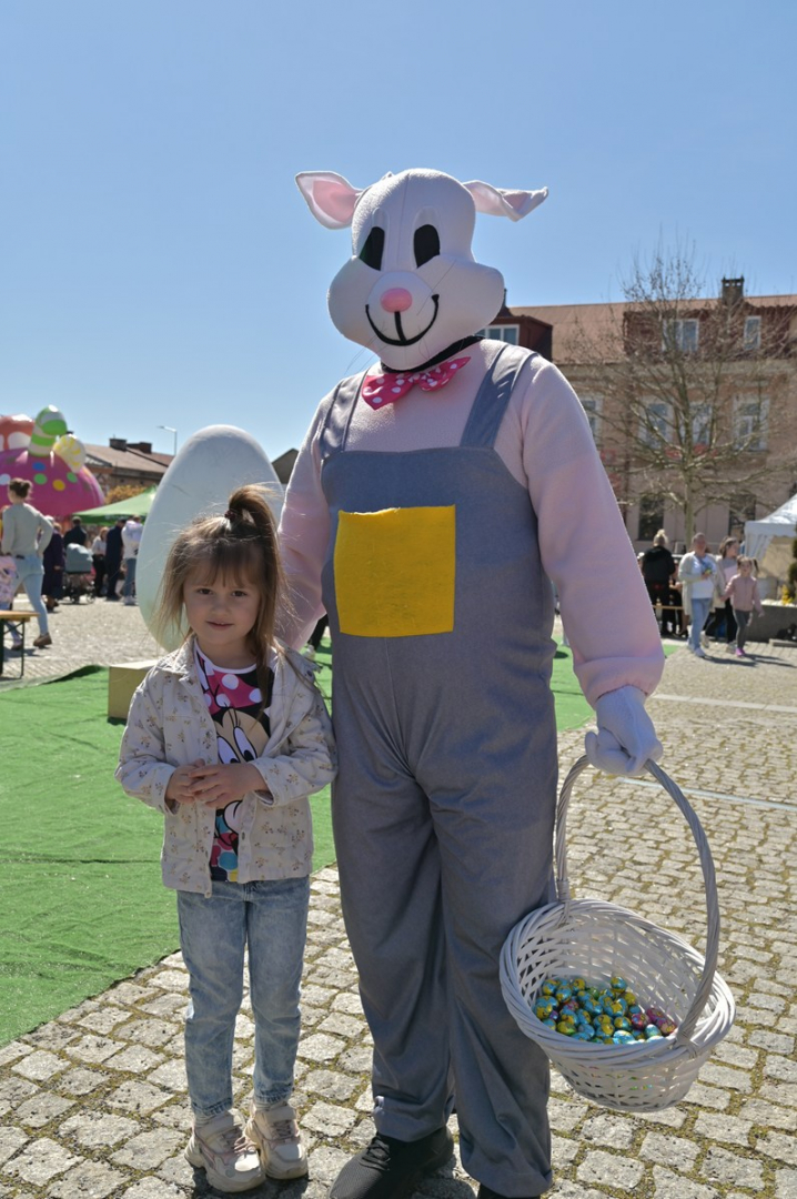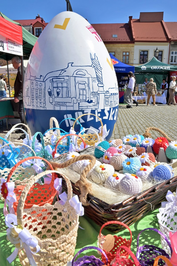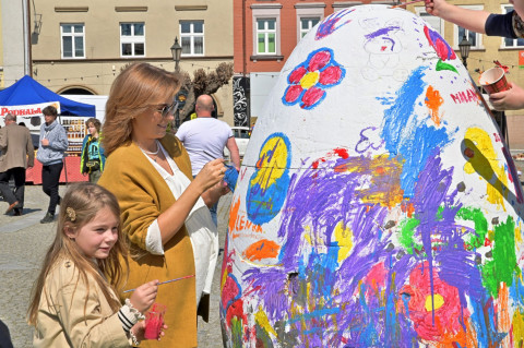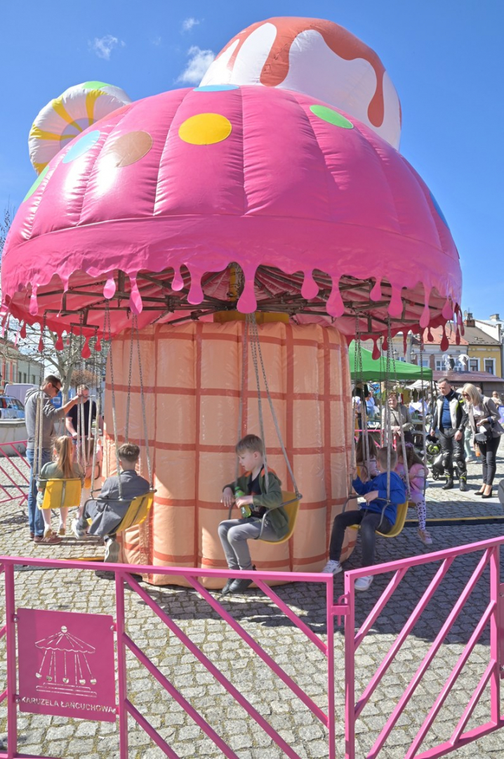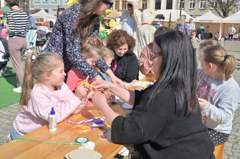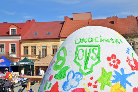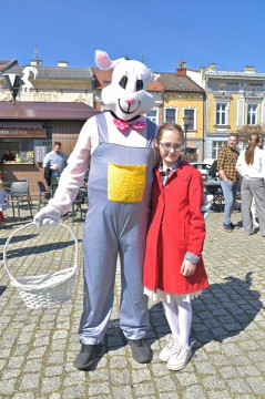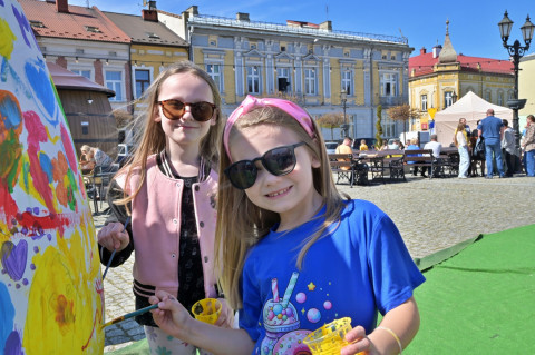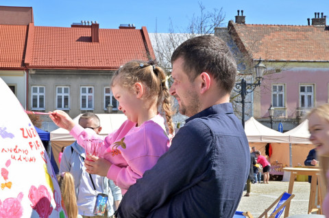 Swoje miejsce jak zwykle znalazły też pisanki XXL, które z zaangażowaniem malowały zgromadzone na rynku dzieci. Najmłodsi oblegali również łańcuchową karuzelę, umiejscowioną jak zwykle niedaleko fontanny oraz prowadzone przez firmę „Smakołyki od Moniki” warsztaty cukiernicze. Przez jakiś czas rynek ozdabiała będzie wielkanocna girlanda wykonana przez uczestników warsztatów plastyczno-rękodzielniczych pod okiem pań ze świetlicy wiejskiej MOK w Mokrzyskach. Podziału wiekowego nie było natomiast przy wielkanocnej ramce do zdjęć i stoiskach gastronomicznych. Dużą atrakcją jak zwykle był przechadzający się po placu z koszem czekoladowych jajek zając wielkanocny, którego z czasem zastąpili członkowie grup teatralnych GT i Stonoga.