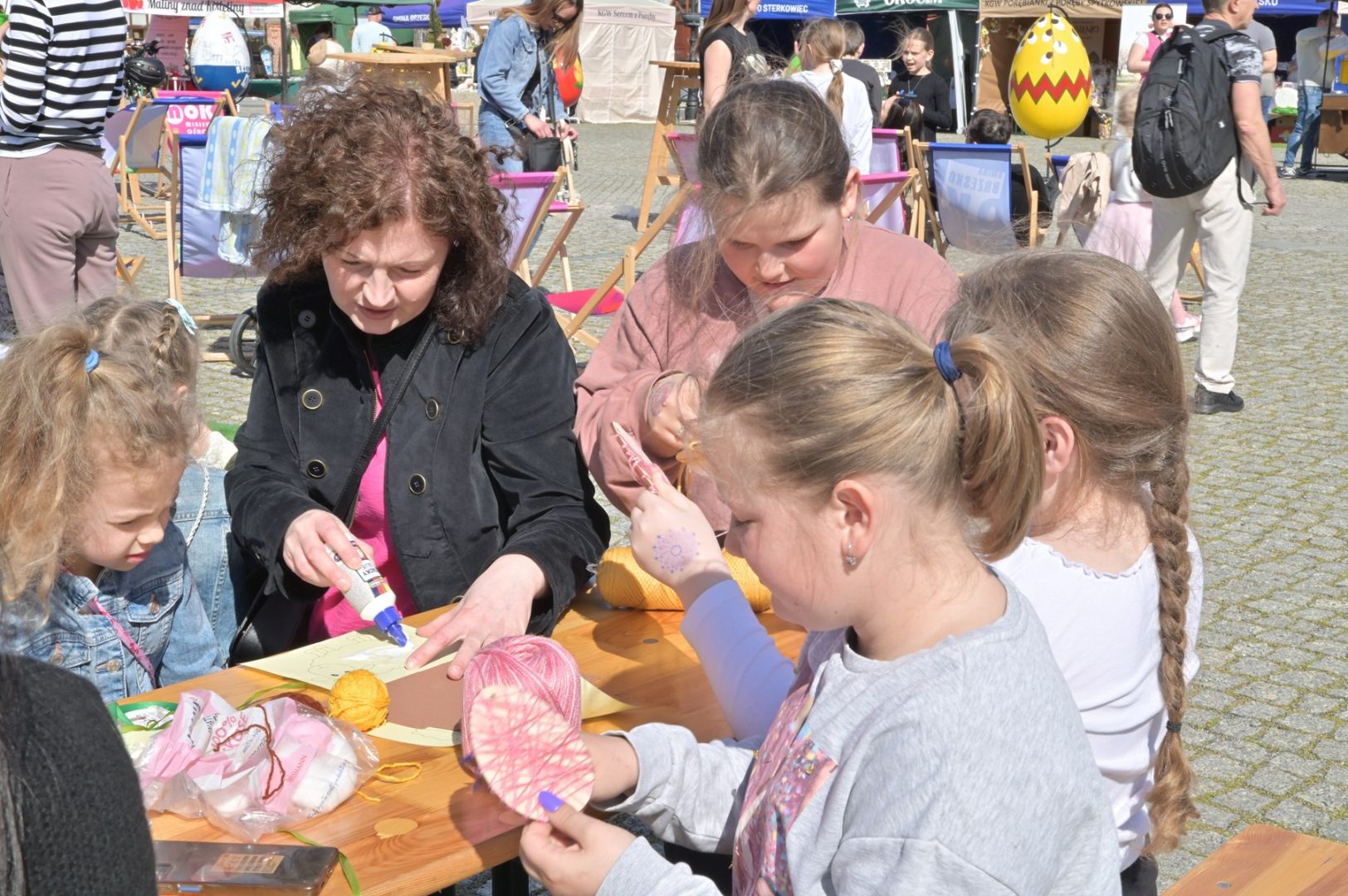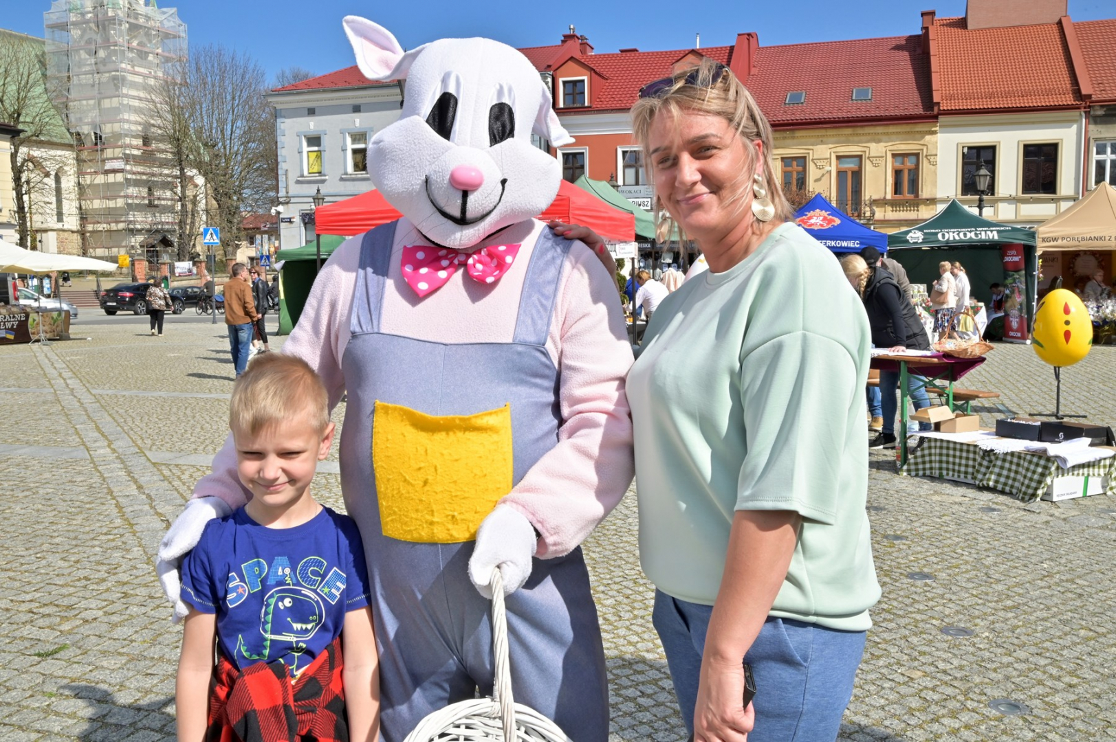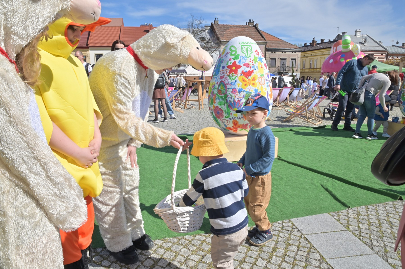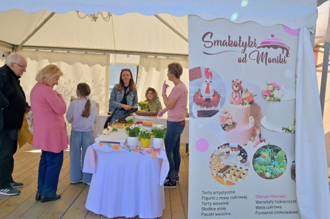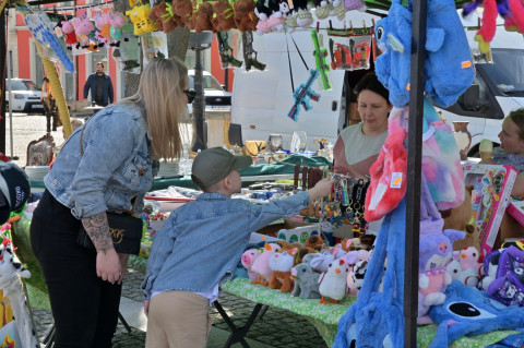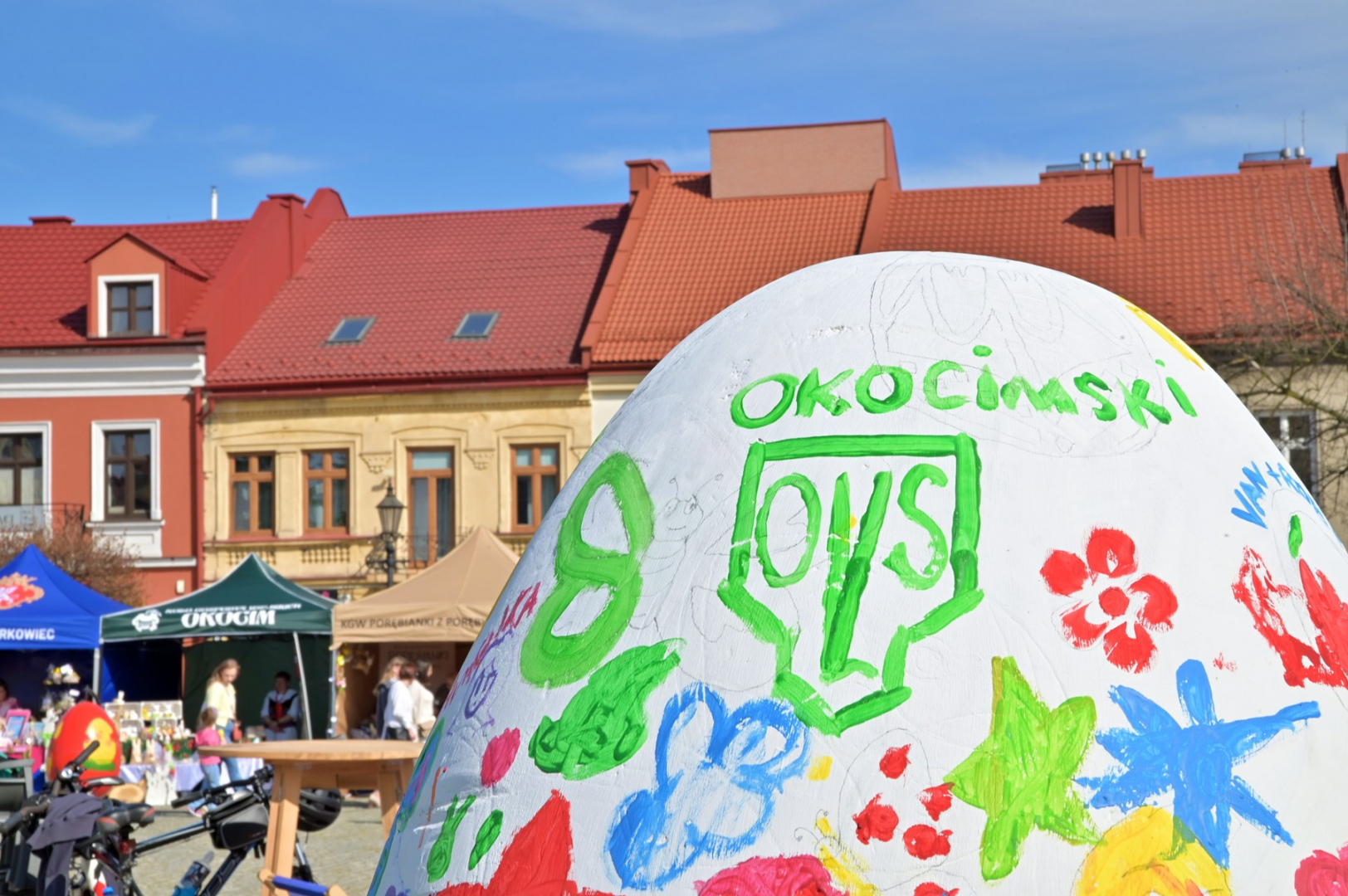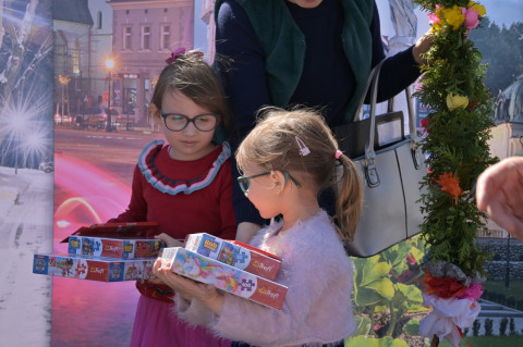 Swoje miejsce jak zwykle znalazły też pisanki XXL, które z zaangażowaniem malowały zgromadzone na rynku dzieci. Najmłodsi oblegali również łańcuchową karuzelę, umiejscowioną jak zwykle niedaleko fontanny oraz prowadzone przez firmę „Smakołyki od Moniki” warsztaty cukiernicze. Przez jakiś czas rynek ozdabiała będzie wielkanocna girlanda wykonana przez uczestników warsztatów plastyczno-rękodzielniczych pod okiem pań ze świetlicy wiejskiej MOK w Mokrzyskach. Podziału wiekowego nie było natomiast przy wielkanocnej ramce do zdjęć i stoiskach gastronomicznych. Dużą atrakcją jak zwykle był przechadzający się po placu z koszem czekoladowych jajek zając wielkanocny, którego z czasem zastąpili członkowie grup teatralnych GT i Stonoga.