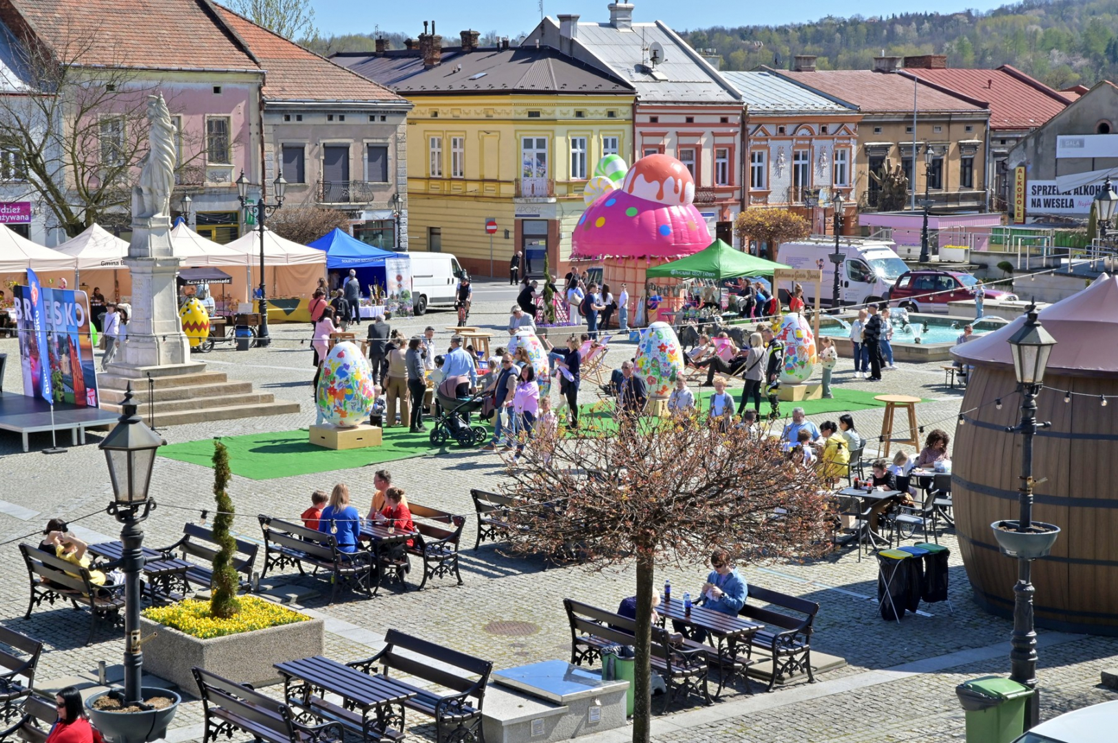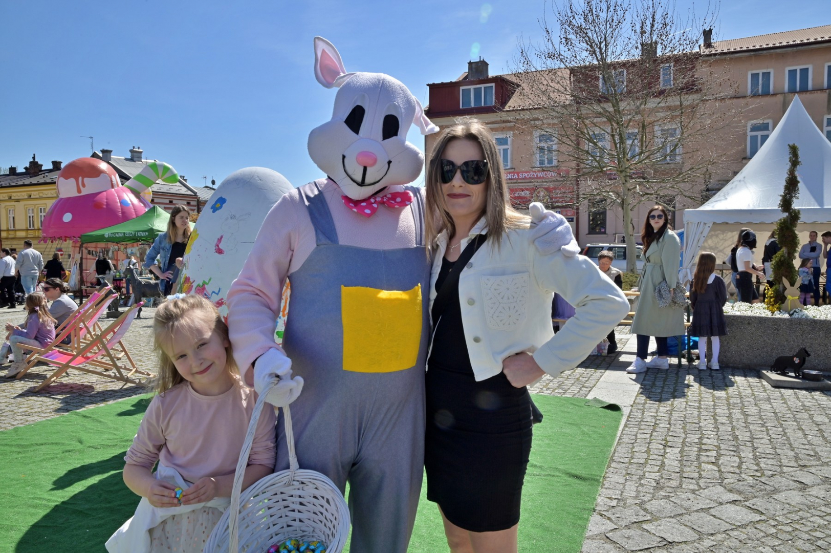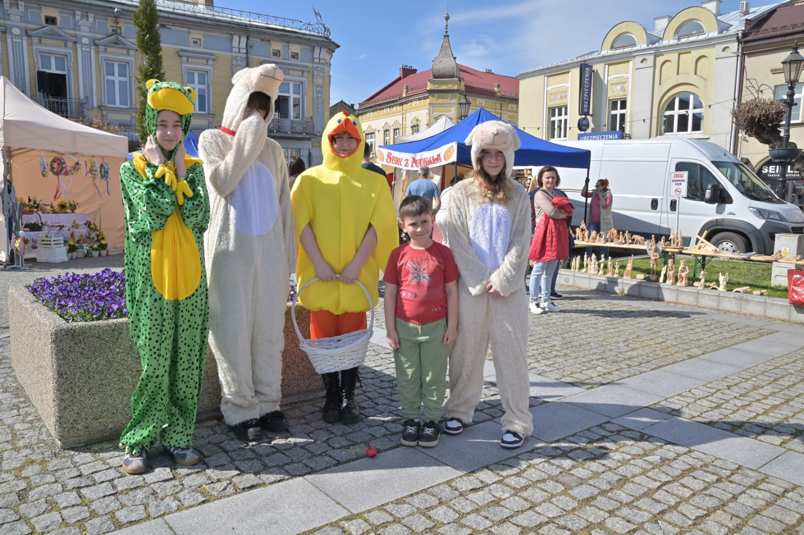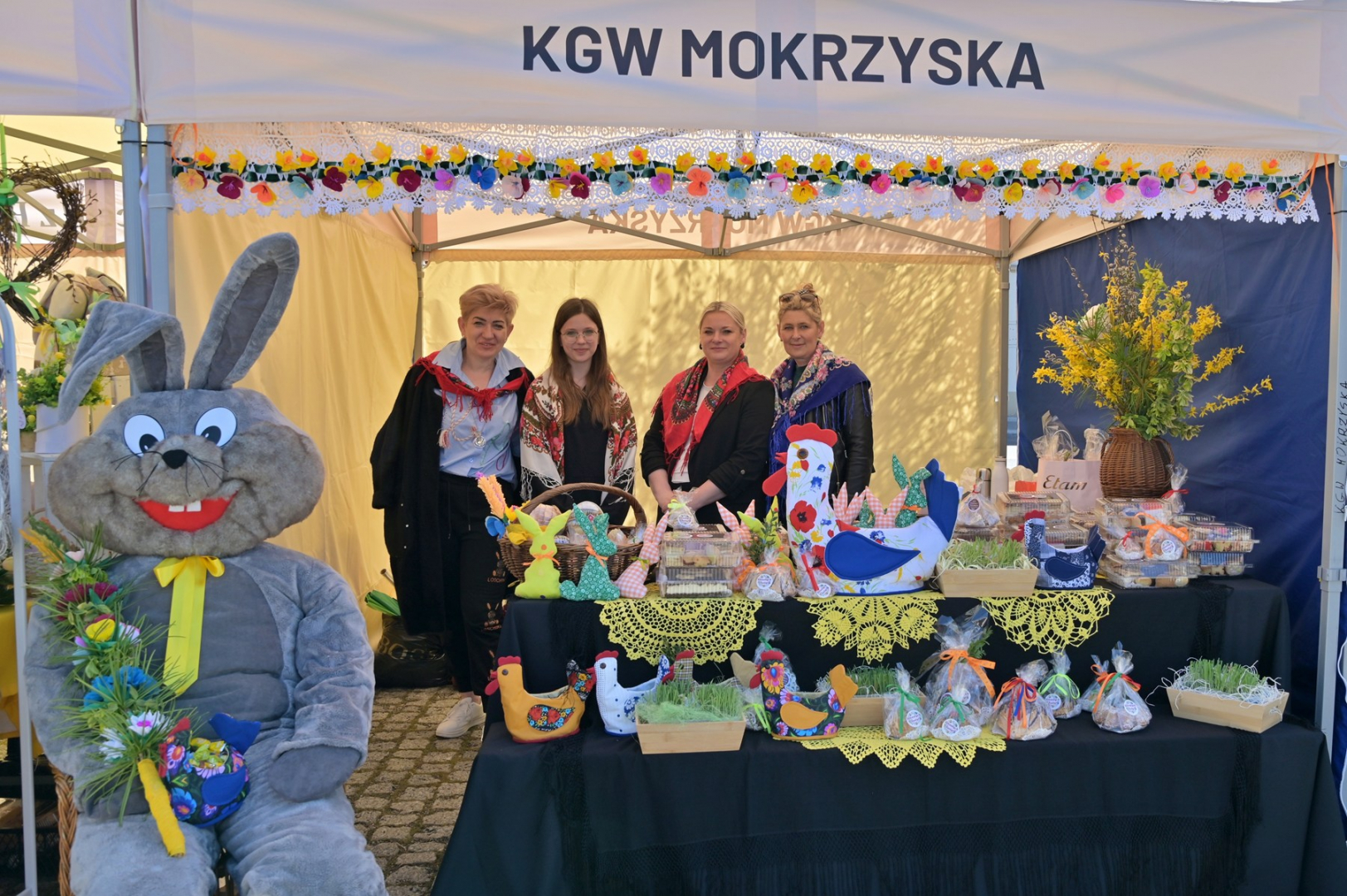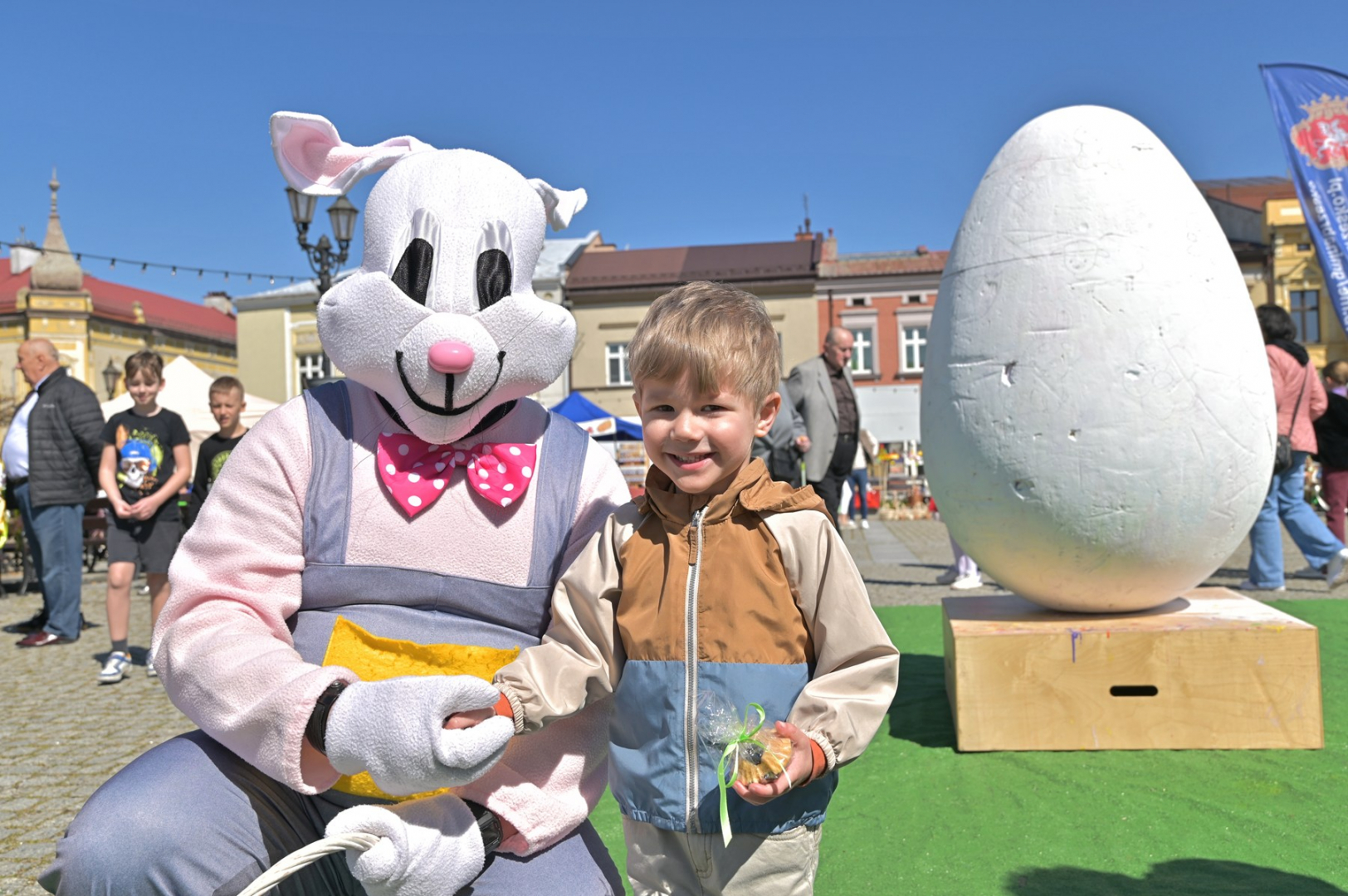 Swoje miejsce jak zwykle znalazły też pisanki XXL, które z zaangażowaniem malowały zgromadzone na rynku dzieci. Najmłodsi oblegali również łańcuchową karuzelę, umiejscowioną jak zwykle niedaleko fontanny oraz prowadzone przez firmę „Smakołyki od Moniki” warsztaty cukiernicze. Przez jakiś czas rynek ozdabiała będzie wielkanocna girlanda wykonana przez uczestników warsztatów plastyczno-rękodzielniczych pod okiem pań ze świetlicy wiejskiej MOK w Mokrzyskach. Podziału wiekowego nie było natomiast przy wielkanocnej ramce do zdjęć i stoiskach gastronomicznych. Dużą atrakcją jak zwykle był przechadzający się po placu z koszem czekoladowych jajek zając wielkanocny, którego z czasem zastąpili członkowie grup teatralnych GT i Stonoga.