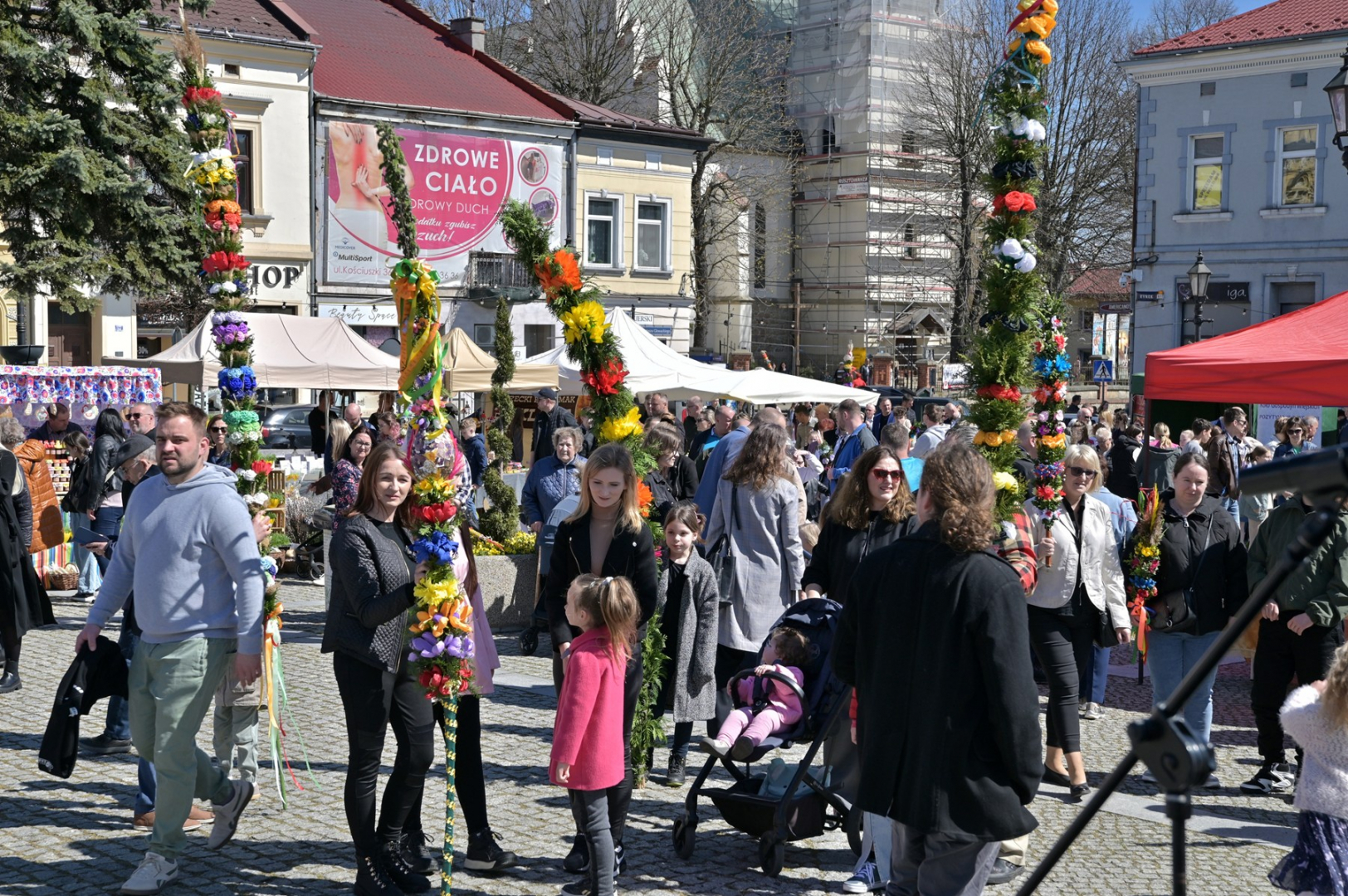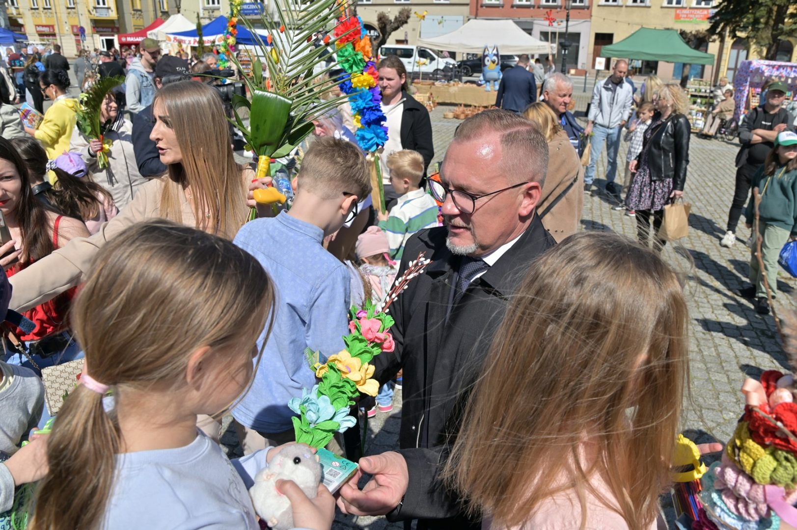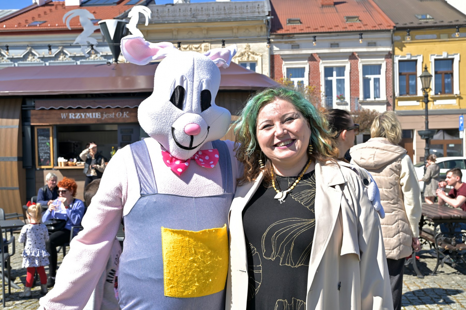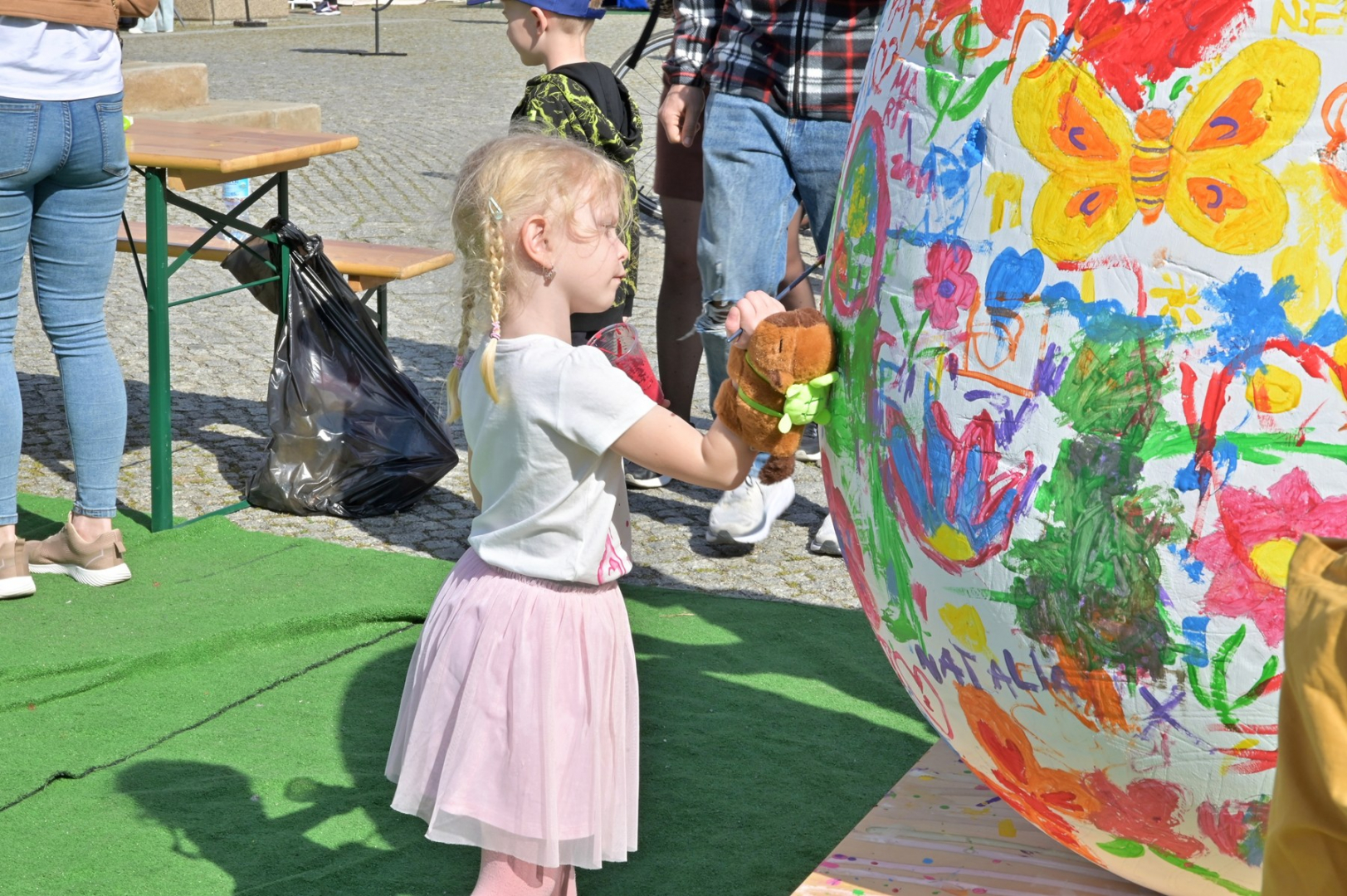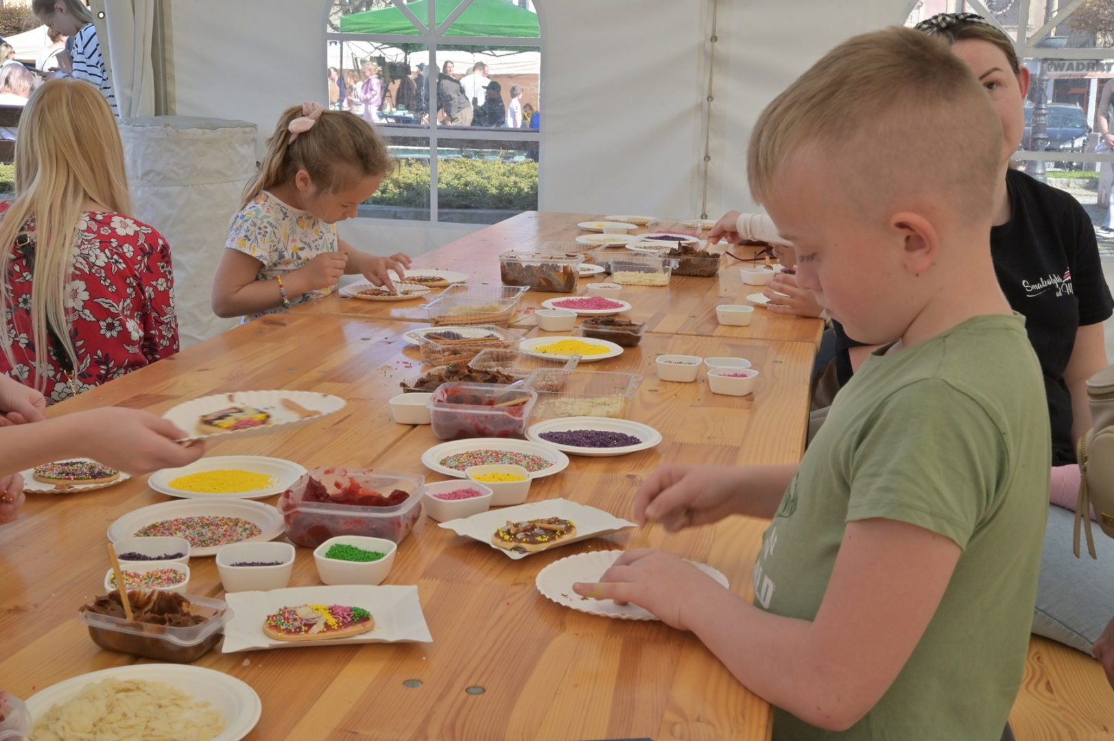 Swoje miejsce jak zwykle znalazły też pisanki XXL, które z zaangażowaniem malowały zgromadzone na rynku dzieci. Najmłodsi oblegali również łańcuchową karuzelę, umiejscowioną jak zwykle niedaleko fontanny oraz prowadzone przez firmę „Smakołyki od Moniki” warsztaty cukiernicze. Przez jakiś czas rynek ozdabiała będzie wielkanocna girlanda wykonana przez uczestników warsztatów plastyczno-rękodzielniczych pod okiem pań ze świetlicy wiejskiej MOK w Mokrzyskach. Podziału wiekowego nie było natomiast przy wielkanocnej ramce do zdjęć i stoiskach gastronomicznych. Dużą atrakcją jak zwykle był przechadzający się po placu z koszem czekoladowych jajek zając wielkanocny, którego z czasem zastąpili członkowie grup teatralnych GT i Stonoga.