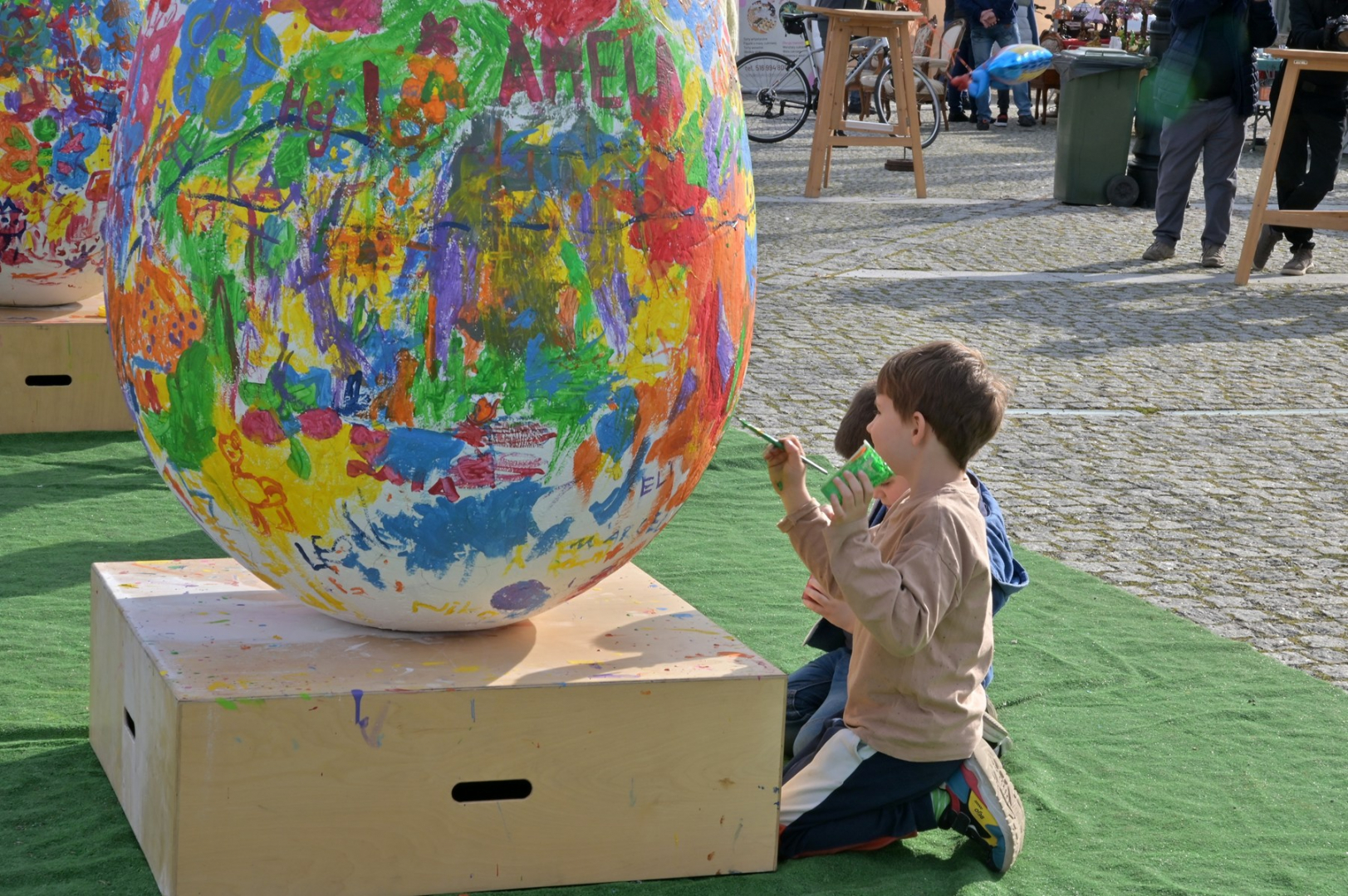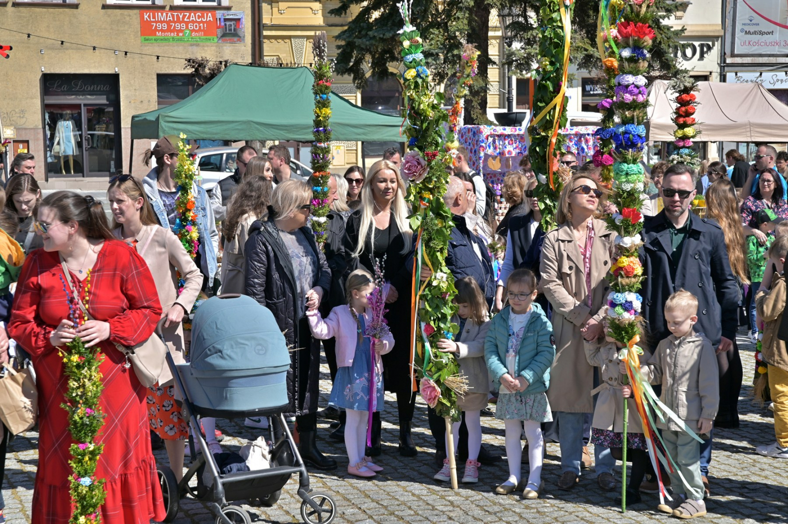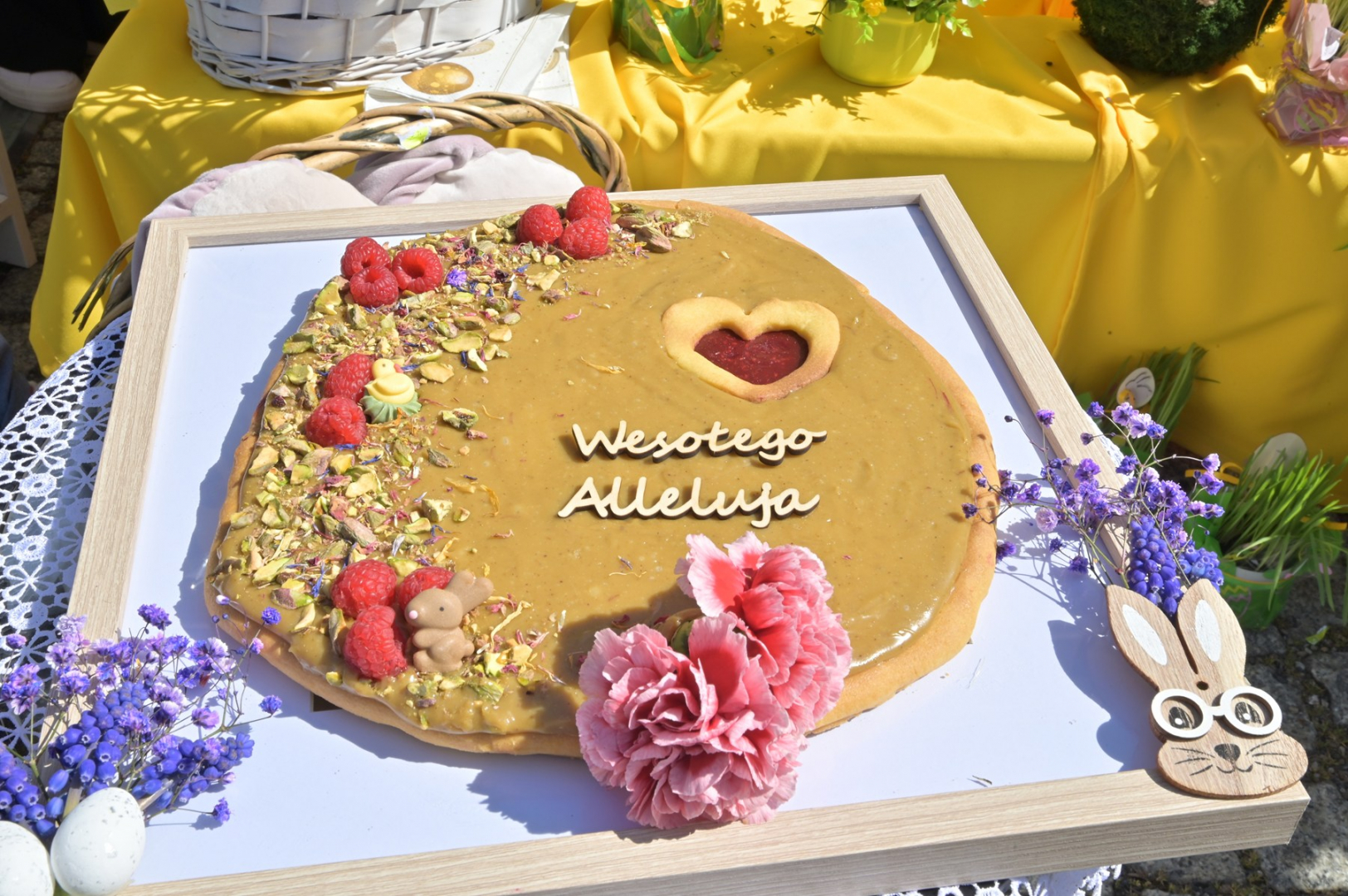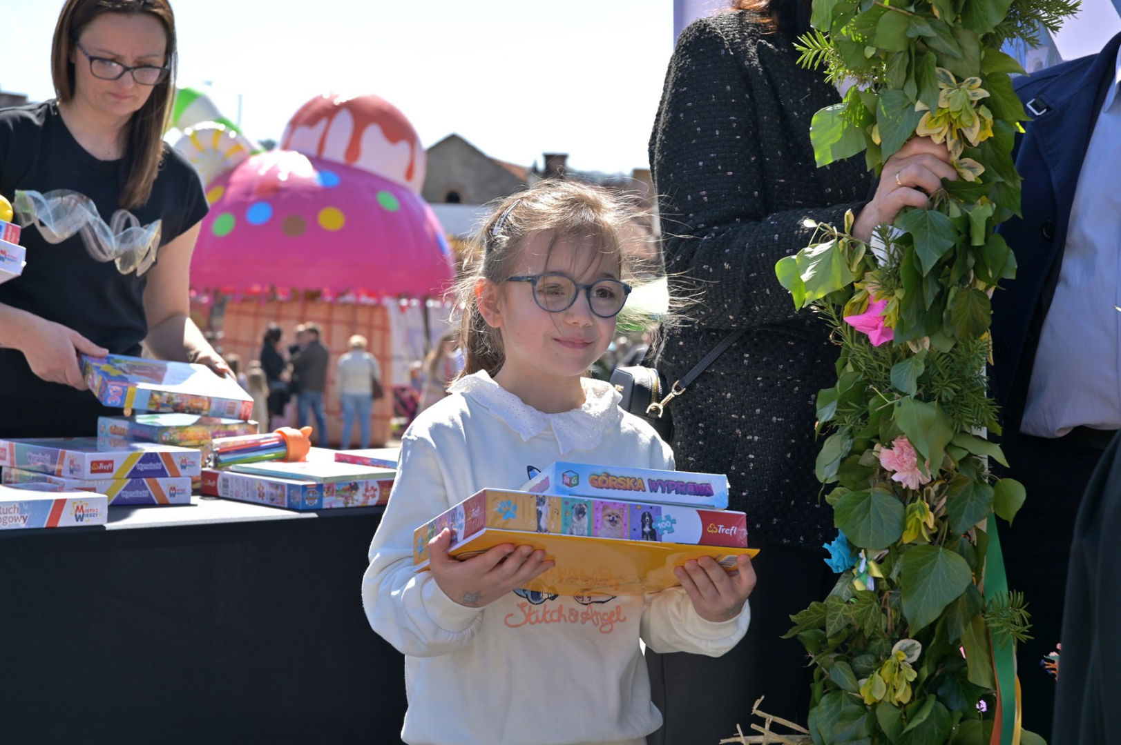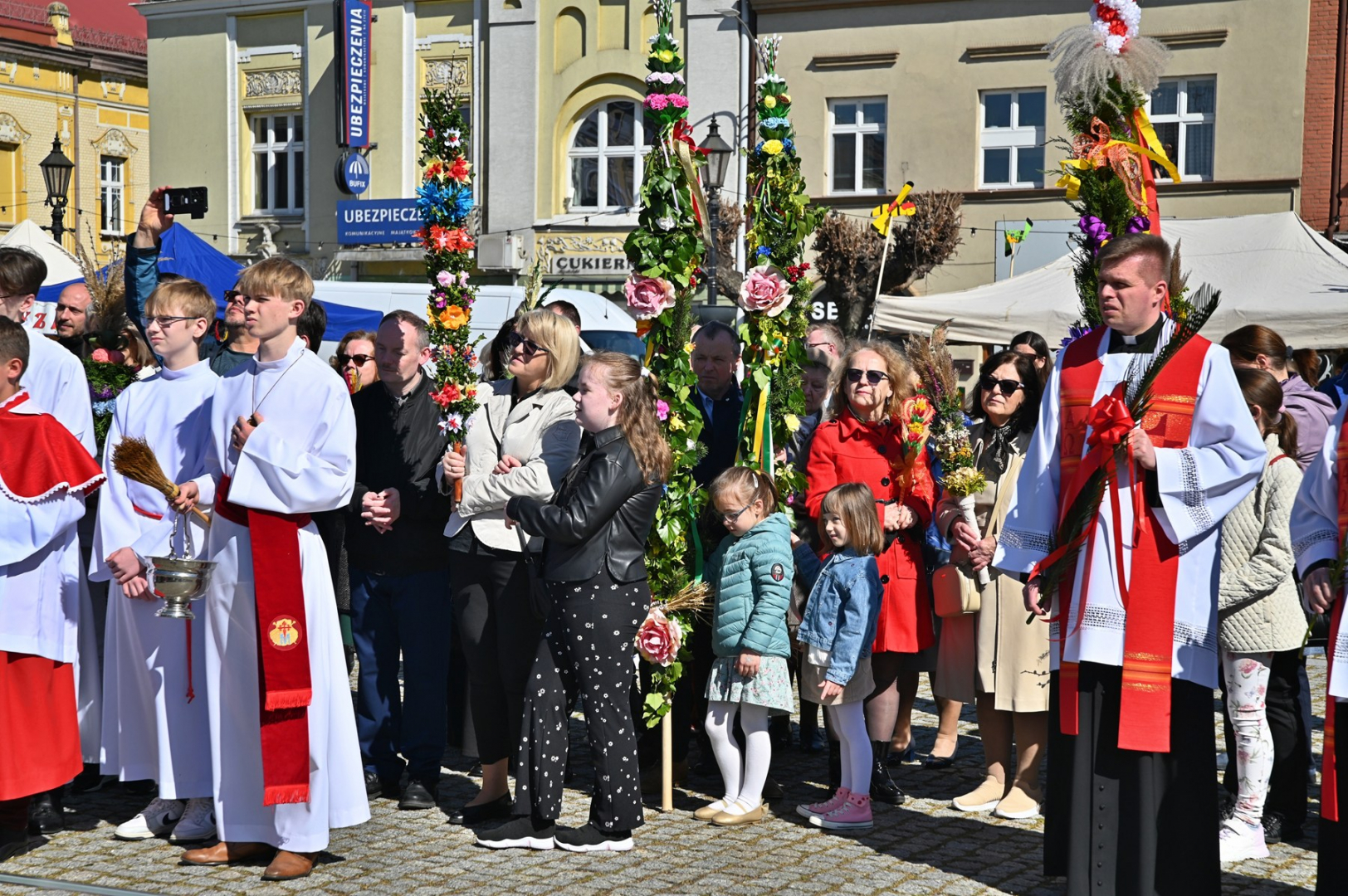 Swoje miejsce jak zwykle znalazły też pisanki XXL, które z zaangażowaniem malowały zgromadzone na rynku dzieci. Najmłodsi oblegali również łańcuchową karuzelę, umiejscowioną jak zwykle niedaleko fontanny oraz prowadzone przez firmę „Smakołyki od Moniki” warsztaty cukiernicze. Przez jakiś czas rynek ozdabiała będzie wielkanocna girlanda wykonana przez uczestników warsztatów plastyczno-rękodzielniczych pod okiem pań ze świetlicy wiejskiej MOK w Mokrzyskach. Podziału wiekowego nie było natomiast przy wielkanocnej ramce do zdjęć i stoiskach gastronomicznych. Dużą atrakcją jak zwykle był przechadzający się po placu z koszem czekoladowych jajek zając wielkanocny, którego z czasem zastąpili członkowie grup teatralnych GT i Stonoga.