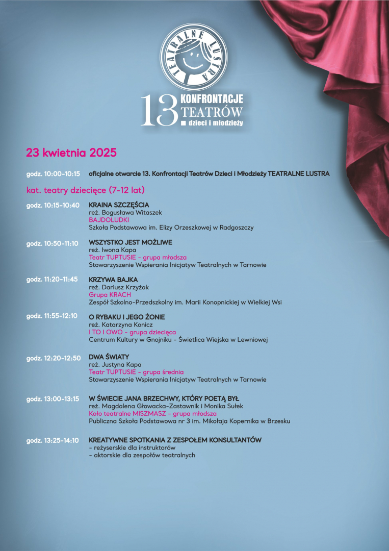 Miejski Ośrodek Kultury w Brzesku wraz z Małopolskim Centrum Kultury SOKÓŁ serdecznie zaprasza na brzeskie święto teatru, czyli 13. Konfrontacje Teatrów Dzieci i Młodzieży TEATRALNE LUSTRA.