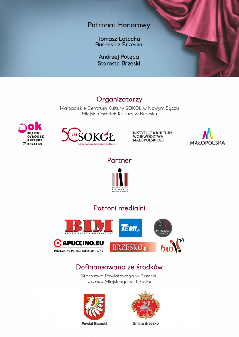 Patronat Honorowy nad wydarzeniem sprawują Burmistrz Brzeska Tomasz Latocha oraz Starosta Brzeski Andrzej Potępa. Dofinansowano ze środków Urzędu Miejskiego w Brzesku i Starostwa Powiatowego w Brzesku.