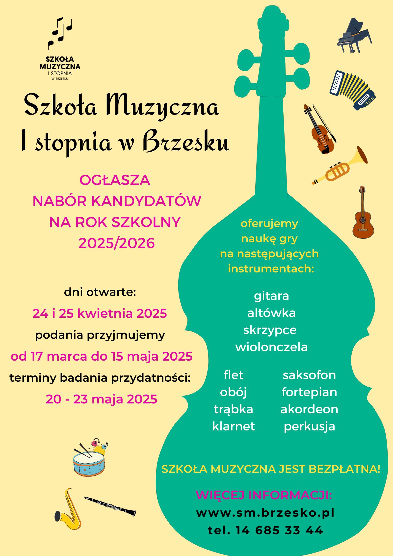 Szkoła Muzyczna I stopnia w Brzesku ogłasza nabór na rok szkolny 2025/2026. W ofercie dydaktyczno-edukacyjnej znajduje się nauka gry na 12 różnych instrumentach. Nauka jest bezpłatna, a odbywa się w dwóch cyklach – czteroletnim i sześcioletnim. W klasie pierwszej uczniowie oprócz doskonalenia gry na instrumencie głównym zgłębiają zagadnienia związane z podstawami rytmiki oraz uczestniczą w zajęciach z kształcenia słuchu.