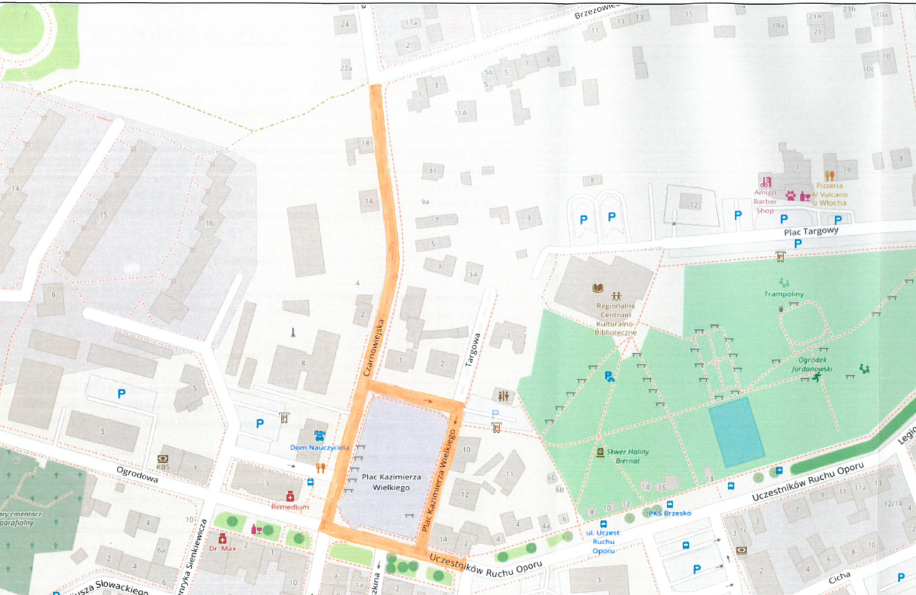 1. parking na Placu Targowym - cały z pozostawieniem kilku miejsc postojowych dla kientów sklepów znajdujących sie przy Placu Targowym,