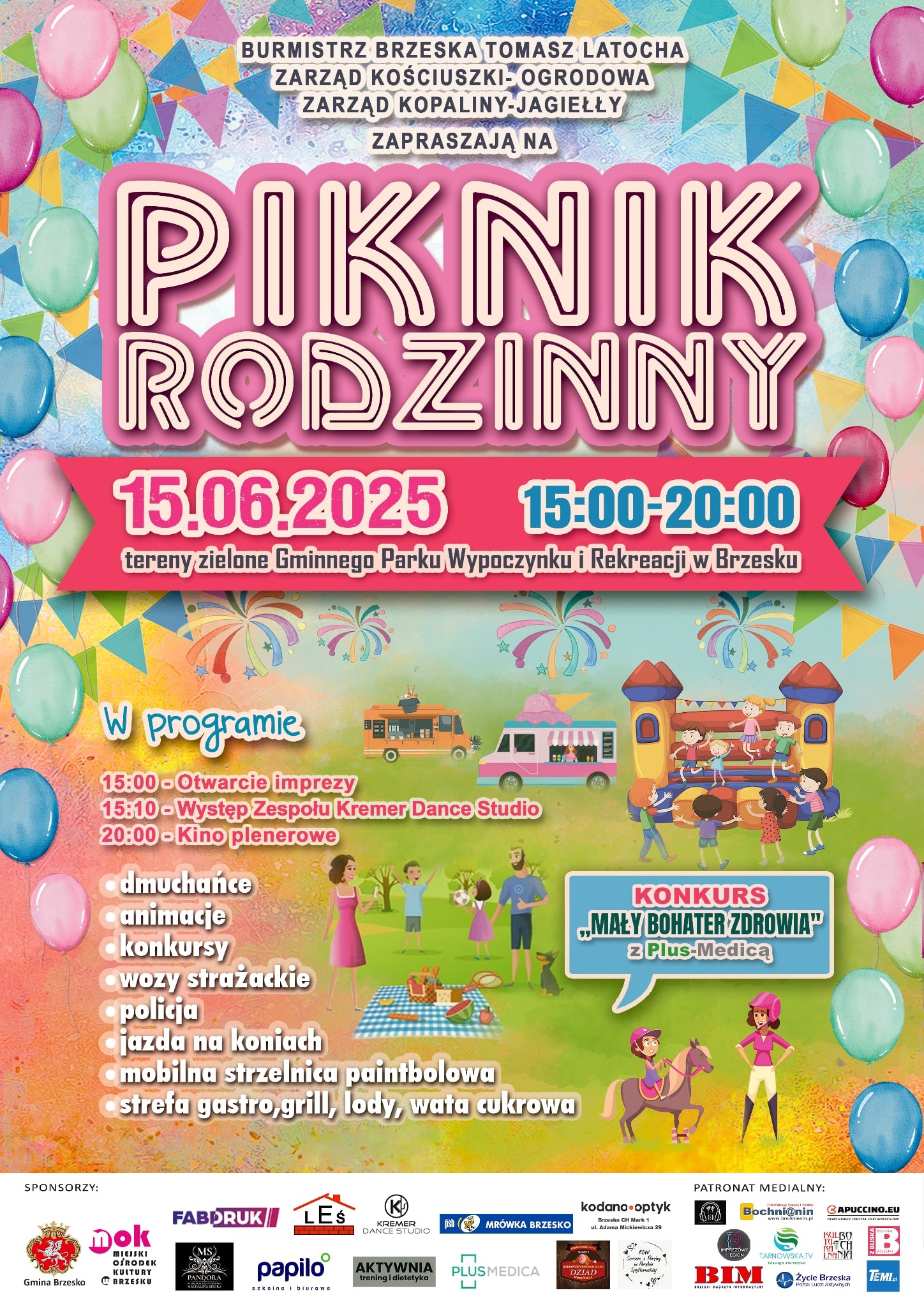 Burmistrz Brzeska Tomasz Latocha, Przewodnicząca osiedla Kościuszki-Ogrodowa Renata Kornaś-Wnek wraz z zarządem, oraz Przewodnicząca osiedla Kopaliny-Jagiełły Barbara Borowiecka wraz z zarządem serdecznie zapraszają na PIKNIK RODZINNY, który odbędzie się już 15 czerwca 2025 (niedziela) na terenach Gminnego Parku Wypoczynku i Rekreacji w Brzesku (obok sklepu Carrefour).