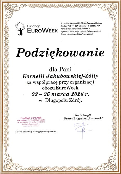 Uczniom naszej szkoły tak bardzo podobało się na Euroweek, że pytali czy mogą tam zostać na zawsze. To chyba najlepszy dowód wspaniałej zabawy połączonej z nauką. Szczególne podziękowania dla firmy Jakubas - Kierunek Przygoda i naszego kierowcy Tadeusza Bacy oraz dla opiekunów: Kornelii Jakubowskiej Żółty i Jolanty Gagatek.