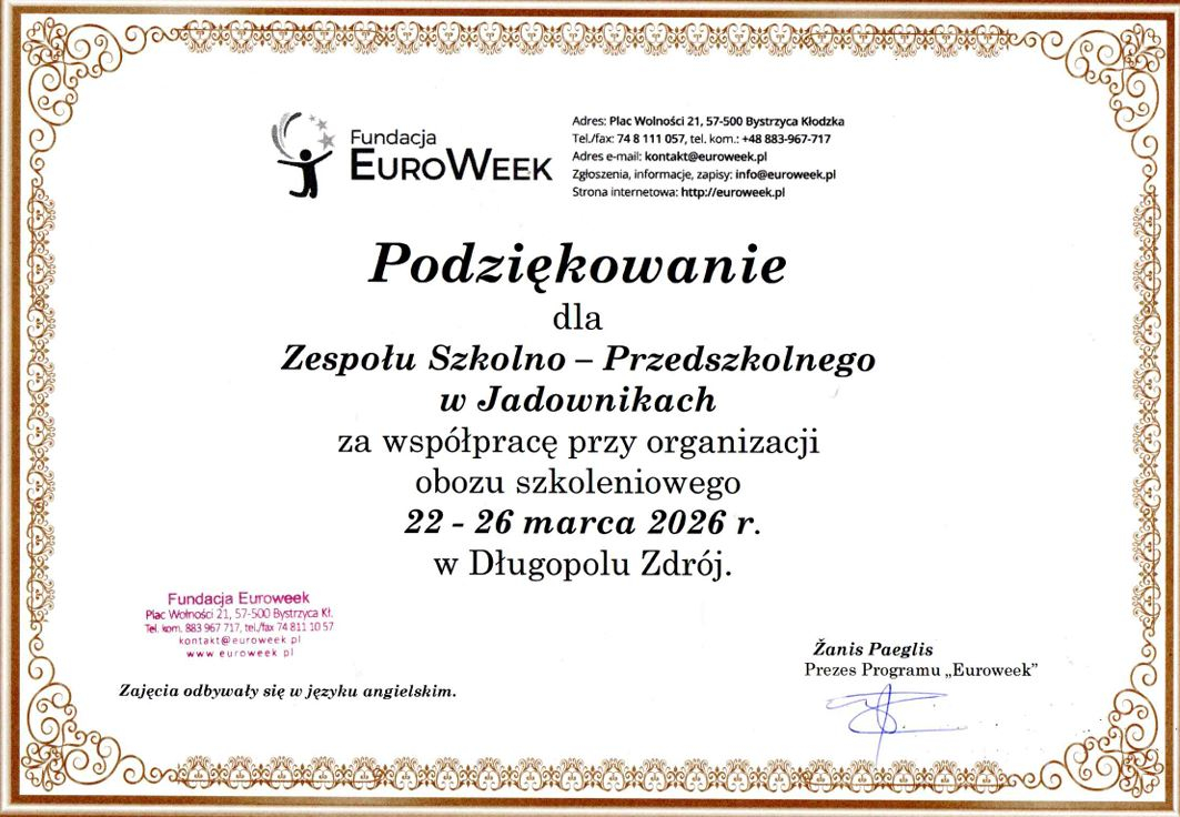 W dniach 22-26.03.2026 uczniowie Zespołu Szkolno-Przedszkolnego w Jadownikach spędzili wspaniały czas pełen wyzwań językowych podczas Euroweeku w Długopolu Zdrój. Każdego dnia współpracowali z wolontariuszami w języku angielskim i poznawali samych siebie, przekraczając swoją strefę komfortu.