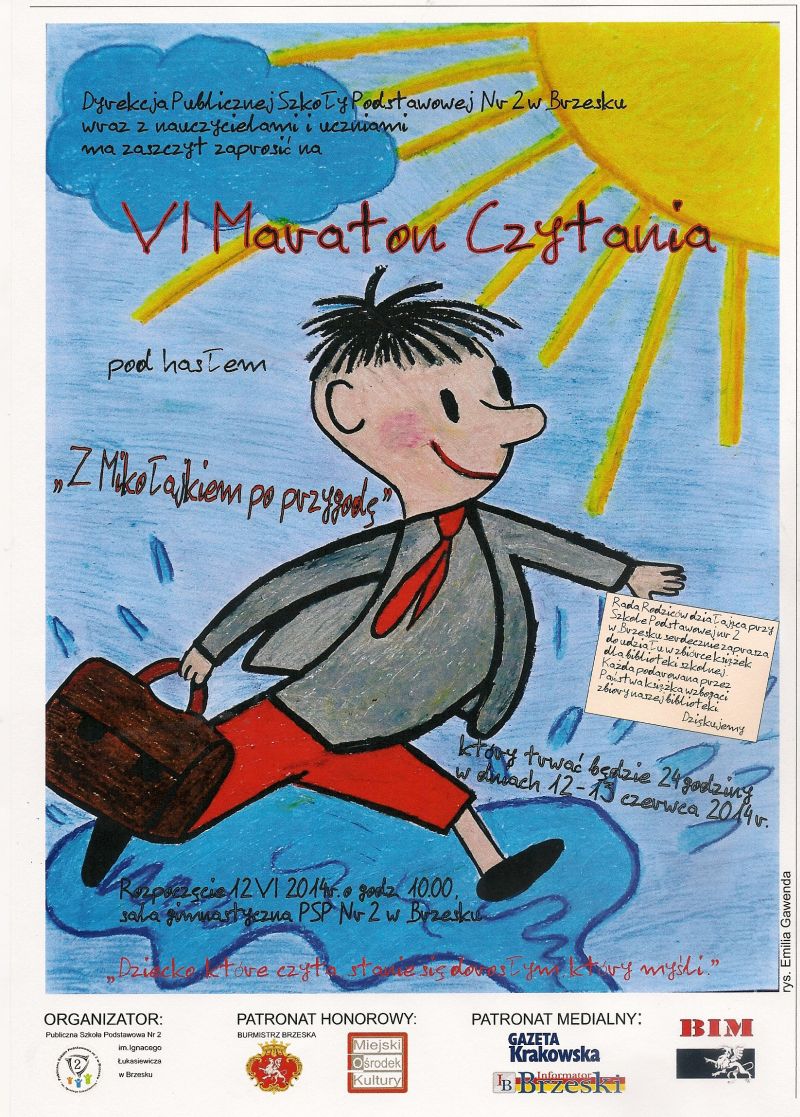 12 czerwca 2014r. o godz. 10.00 w PSP Nr 2 w Brzesku rusza już VI Wielki Maraton Czytania – tym razem pod hasłem „Z Mikołajkiem po przygodę”, który trwać będzie całą dobę.Dzieciaki wraz z dyrekcją i gronem pedagogicznym serdecznie zapraszają wszystkich przyjaciół, znajomych, sympatyków książki i zwolenników osobistych spotkań z ludźmi, zwłaszcza tymi dorastającymi. Każdy może przeczytać fragment książki. Szczegóły na afiszu.Dodatkowo w tym roku Rada Rodziców zaprasza do udziału w zbiórce książek dla biblioteki szkolnej. Każda podarowana książka wzbogaci zbiory biblioteczne i służyć będzie dzieciom.„Dziecko, które czyta, stanie się dorosłym, który myśli.”