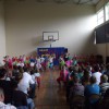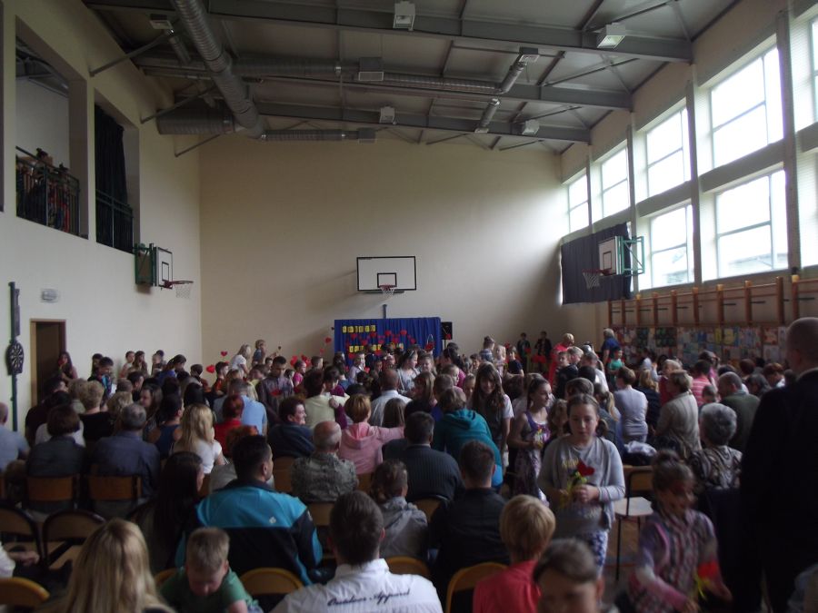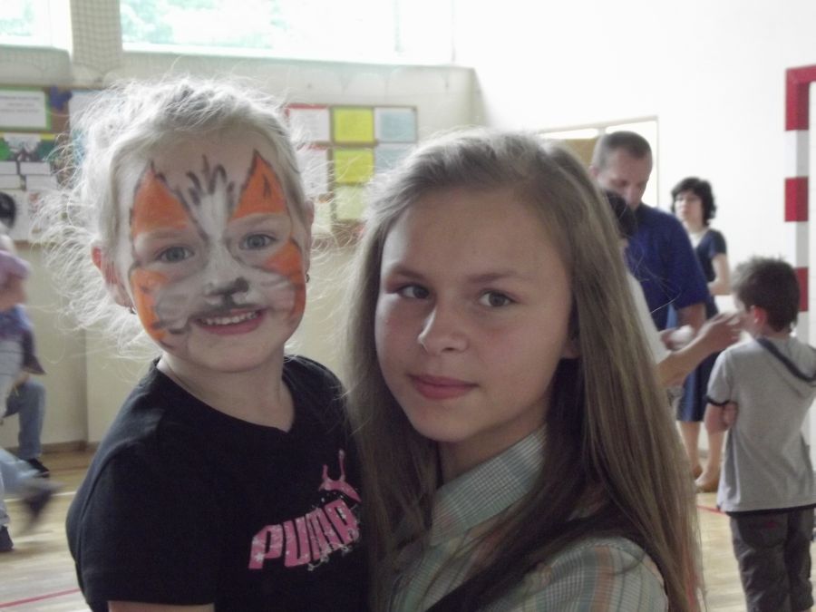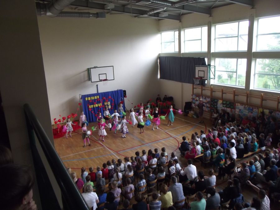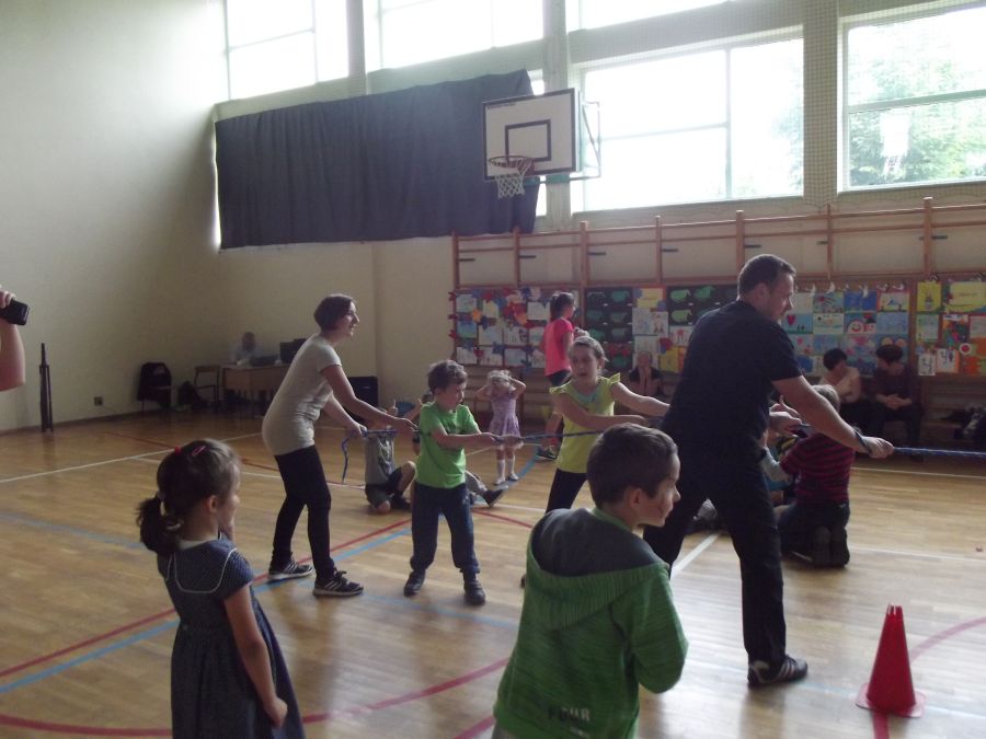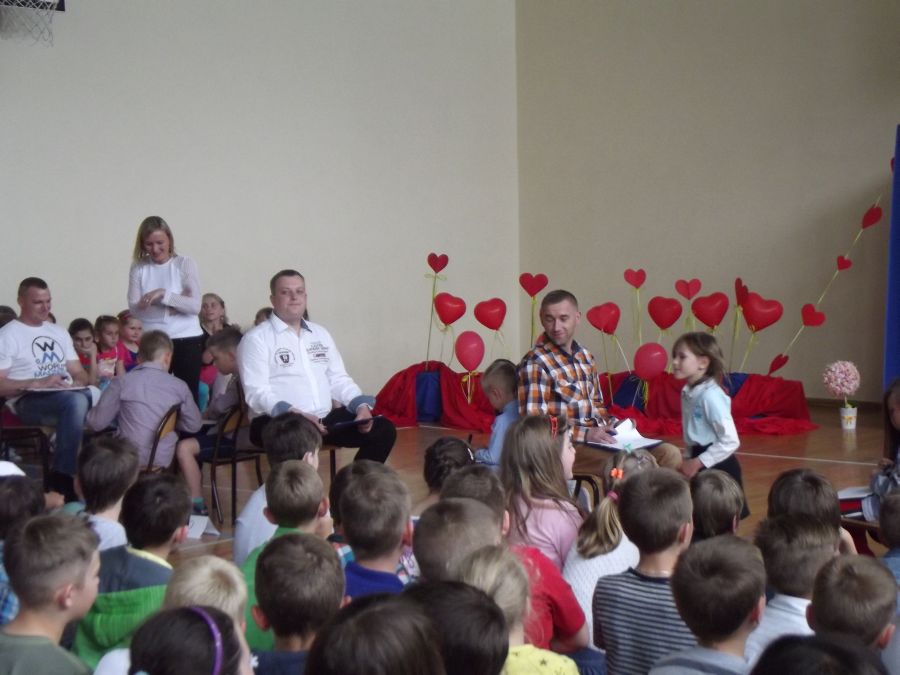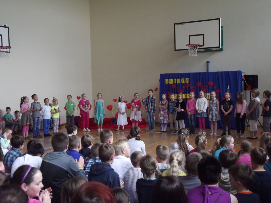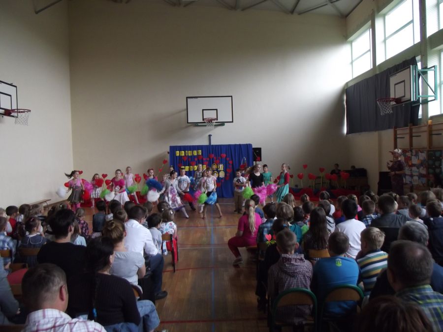 Uczniowie z wielkim artyzmem recytowali wzruszające wiersze. Łza zakręciła się w niejednym oku, kiedy to piosenkę o mamie i tacie przepięknie zaśpiewało trio złożone z uczniów tej klasy. Na zakończenie prezentacji uczniowskich wystąpiły dziewczynki z klasy piątej, które samodzielnie przygotowały i zaprezentowały taniec nowoczesny. Miłym zwieńczeniem tej części programu było wręczenie rodzicom własnoręcznie przygotowanych przez dzieci serduszek. Odbywało się to przy melodii „Cudownych rodziców mam”. Następnie 5 par, złożonych z rodzica i dziecka, brało udział w quizie rodzinnym. Uczestnicy odpowiadali na pytania, a oceniana była zgodność odpowiedzi każdej pary. Zwycięzcy otrzymali nagrody. Później zarówno rodzice, jak i dzieci, mogli wybrać coś dla siebie z rozrywkowej oferty. Dużym powodzeniem cieszyło się malowanie twarzy. Dziecięce buzie mamy ozdabiały malunkami. Nieopodal odbywał się kiermasz bajek. Przygotowano również „Owocową loterię”, która promowała zdrową żywność. Wszystkie owoce w mig się rozeszły. Na sali gimnastycznej odbywały się konkurencje sportowe.