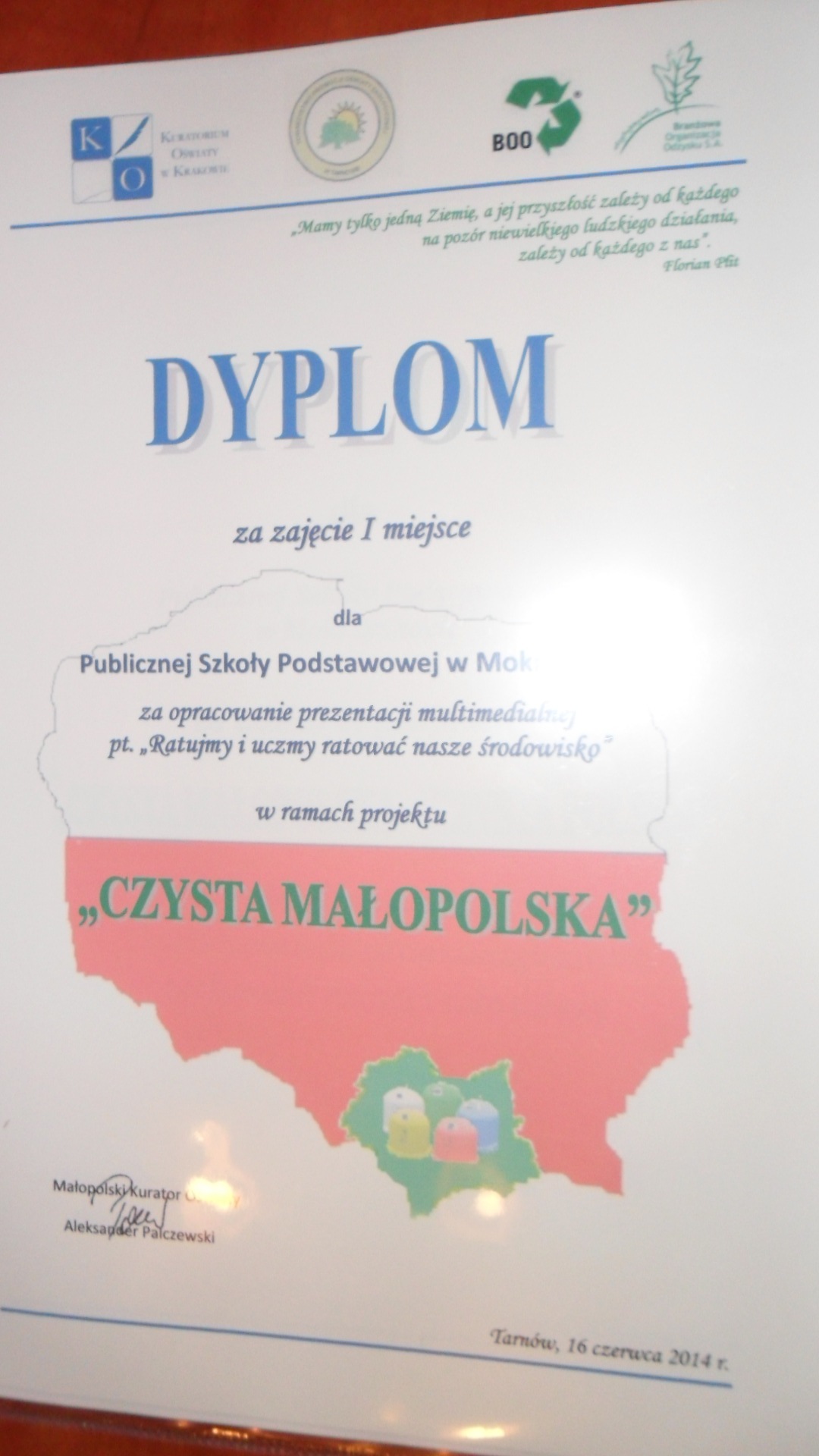 Wydarzenie to było szczególnie ważne dla Szkoły Podstawowej w Mokrzyskach, ponieważ wykonana przez uczniów prezentacja „Ratujmy i uczmy ratować nasze środowisko" zdobyła wyróżnienie. Uroczystego wręczenia nagród dokonał małopolski kurator oświaty Aleksander Palczewski. Szkoła otrzymała w nagrodę dyplom i aparat fotograficzny.