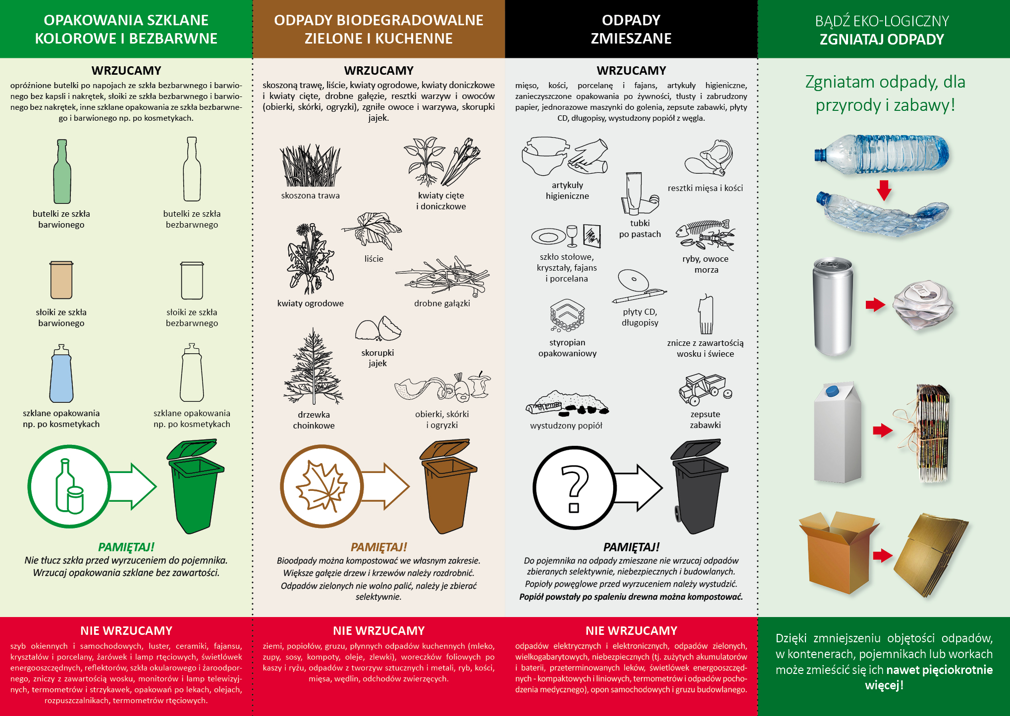 Zanim wrzucisz: opróżnij opakowania z resztek produktów, oczyść opakowania z półpłynnych produktów, zdejmij zakrętki, zgnieć butelki,