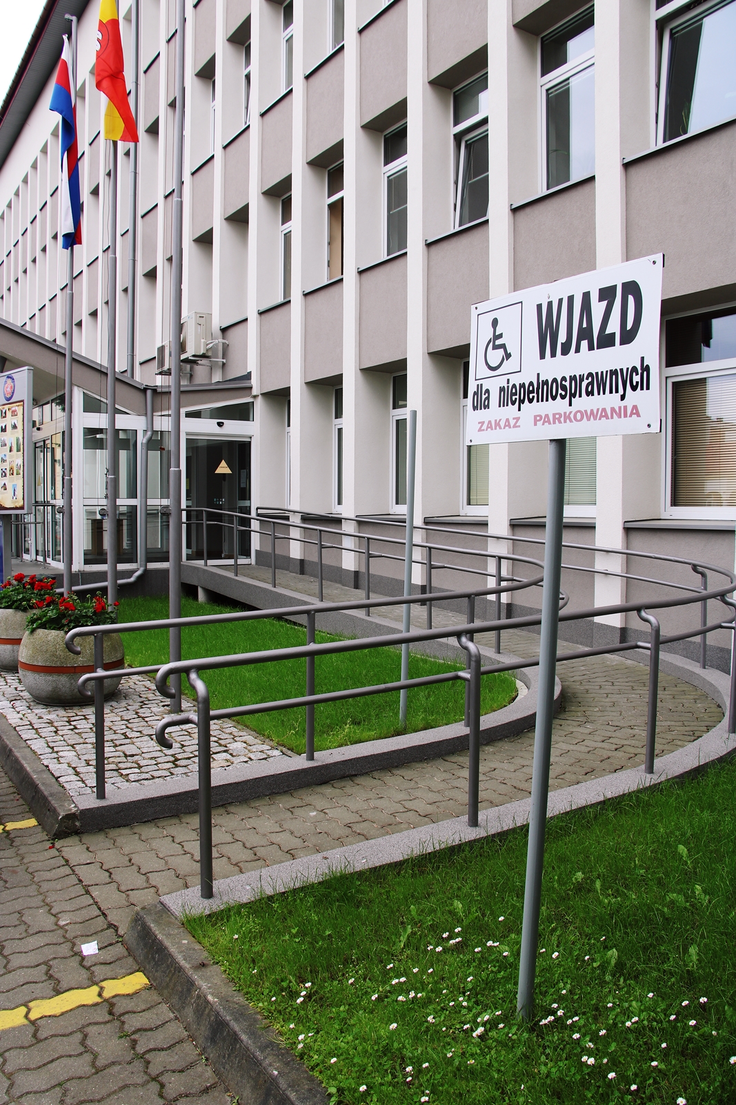 Do budynku prowadzą trzy wejścia. Jedno wejście przystosowane dla osób z niepełnosprawnością znajduje się od północnej strony budynku Urzędu przy parkingu głównym przed budynkiem. Otwierane bezdotykowo wejście jest ogólnodostępne w godzinach pracy urzędu.
