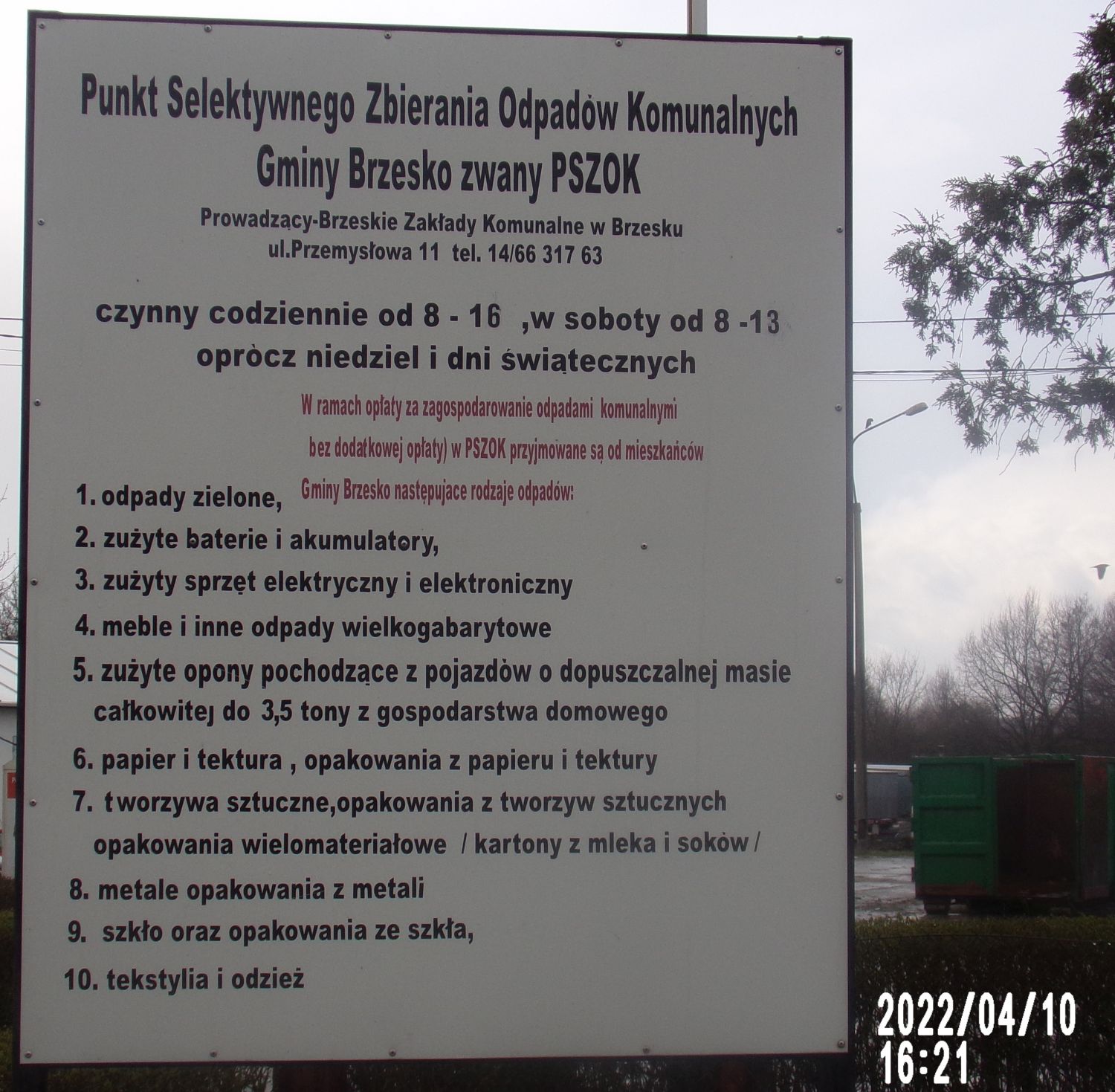 Na terenie bazy magazynowo – transportowej Brzeskich Zakładów Komunalnych przy ul. Przemysłowej 11 w Brzesku znajduje się Punkt Selektywnej Zbiórki Odpadów Komunalnych tzw. PSZOK z którego mogą korzystać mieszkańcy Gminy Brzesko.