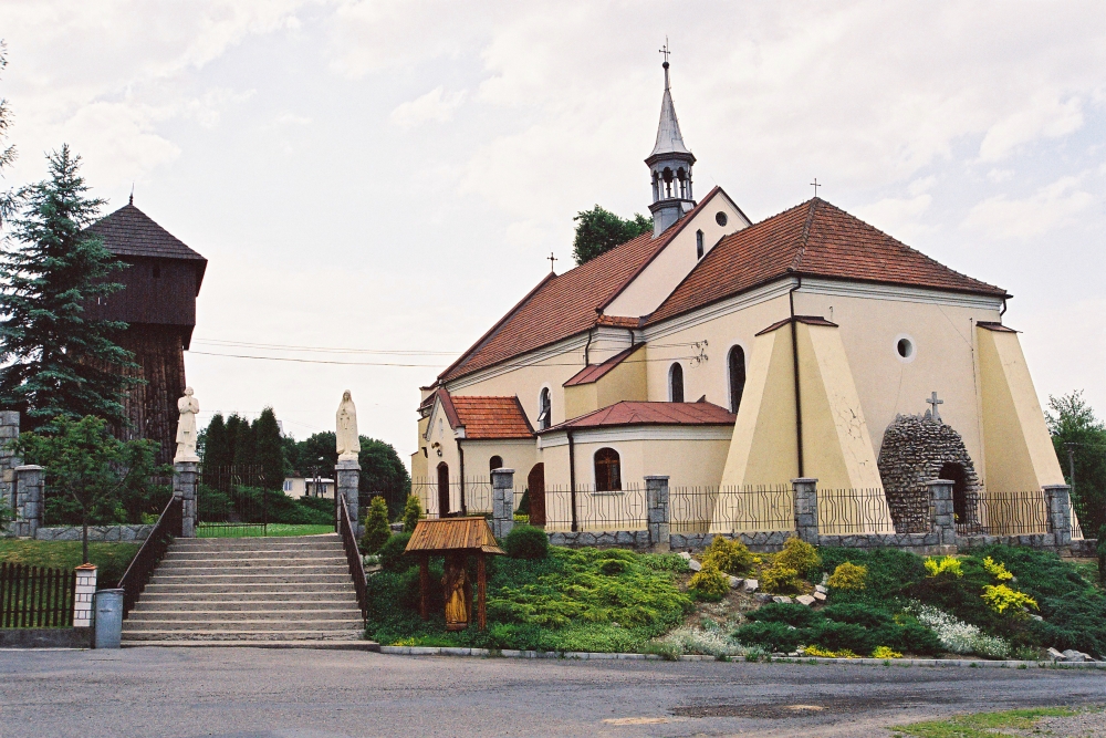 Obok kościoła stoi drewniana pochodząca z XVIII wieku dzwonnica o konstrukcji słupowej z nadwieszoną izbicą. Jest to dziś jedna z największych i najstarszych drewnianych dzwonnic w Małopolsce. Ma ona bowiem kilkanaście metrów wysokości. Jej masywną konstrukcję złożoną z potężnych bali osłania szalowanie z desek pokrywających pochyłe ściany, zaś izbica nakryta gontowym daszkiem namiotowym skrywa trzy duże dzwony, z których największy odlany został z fundacji Stanisława Lubomirskiego przez Balcera Ruguta w 1639 r.
