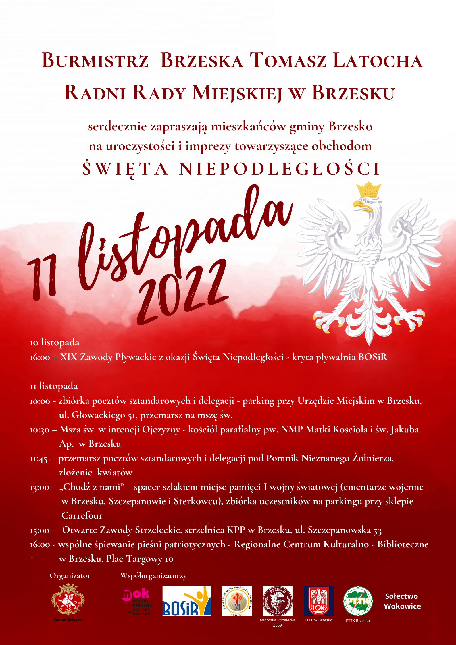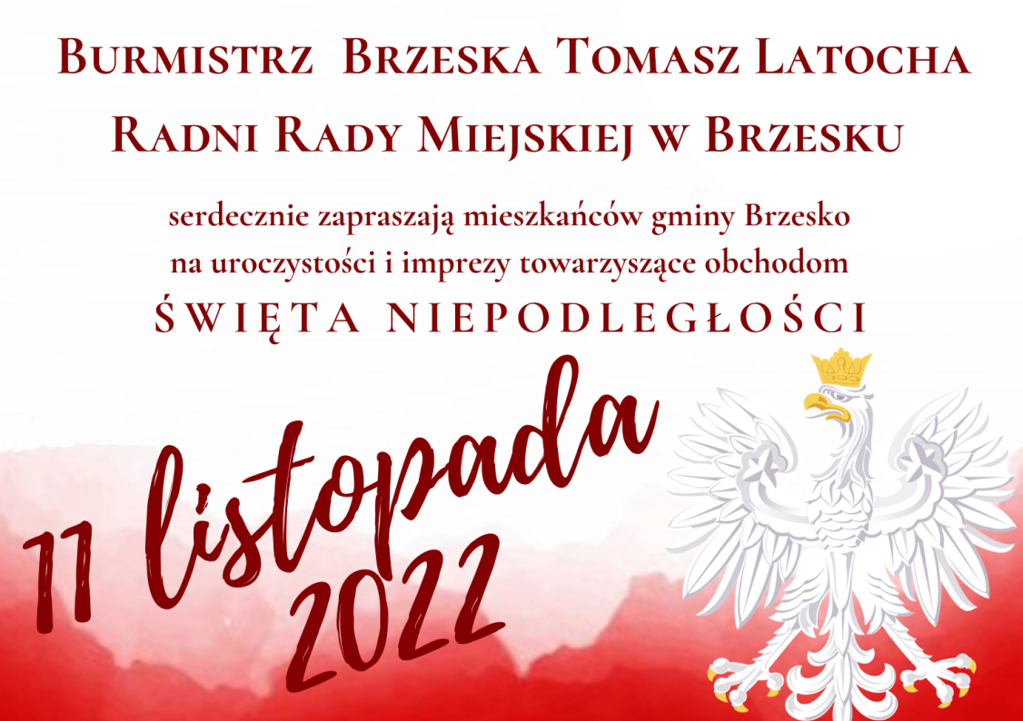Burmistrz Brzeska Tomasz Latocha oraz radni Rady Miejskiej zapraszają na uroczystości i imprezy towarzyszące obchodom Święta Niepodległości.
