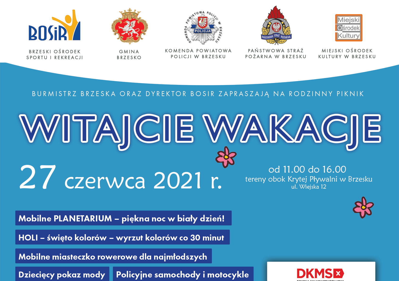 Burmistrz Brzeska oraz Dyrektor BOSiR w Brzesku serdecznie zapraszają wszystkie dzieci wraz z rodzicami na PIKNIK RODZINNY WITAJCIE WAKACJE. Ta wspaniała impreza odbędzie się 27 czerwca 2021 (niedziela) na terenach obok Krytej Pływalni BOSiR w Brzesku.