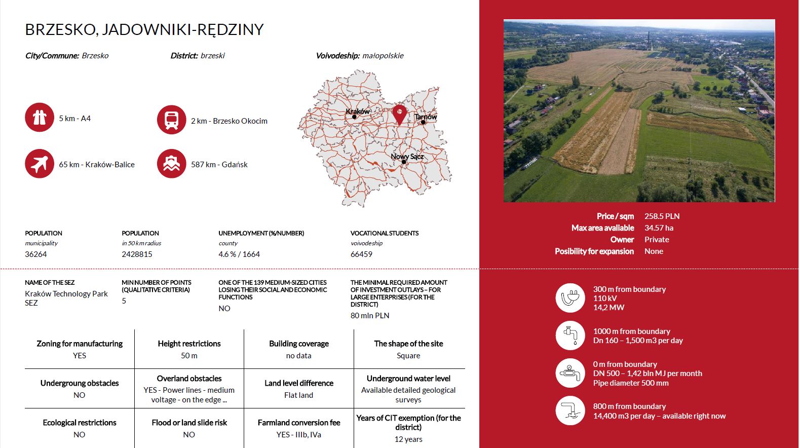 The area of nearly 35 hectares belongs to a private owner. Rędziny is part of a 200 ha industrial zone in the eastern part of Brzesko.