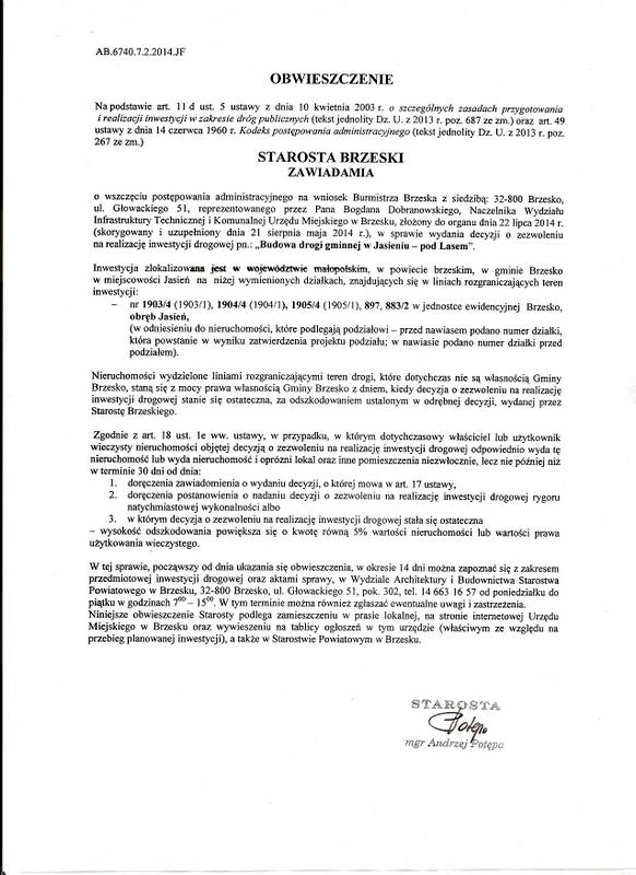 Starosta Brzeski zawiadamia o wszczęciu postępowania administracyjnego w sprawie wydania decyzji o zezwoleniu na realizację inwestycji drogowej w gminie Brzesko, pn: „Budowa drogi gminnej w Jasieniu – pod Lasem".