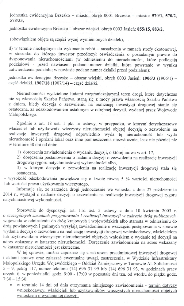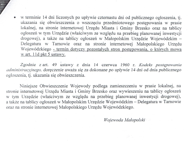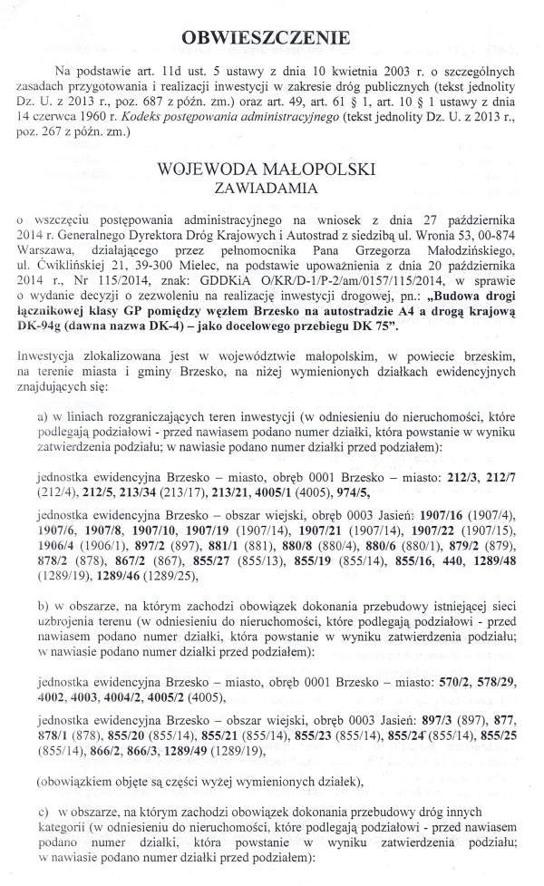 Wojewoda Małopolski zawiadamia o wszczęciu postępowania administracyjnego w sprawie wydania decyzji, zezwalającej na budowę drogi łącznikowej, klasy GP pomiędzy węzłem Brzesko, na autostradzie A4 a drogą krajową DK 94g (krajowa czwórka) jako docelowego przebiegu DK 75.