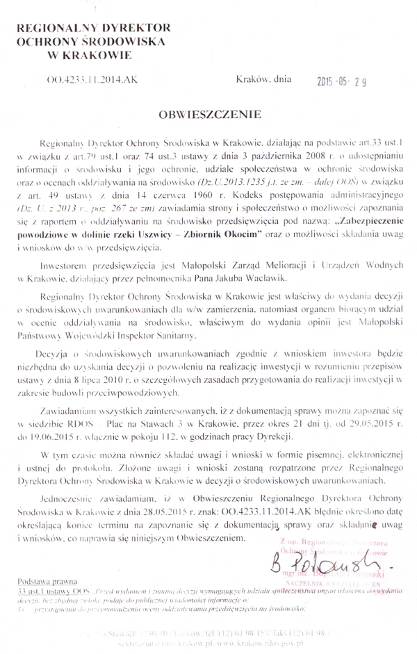 Regionalny Dyrektor Ochrony Środowiska w Krakowie zawiadamia o możliwości zaznajomienia się z raportem o oddziaływaniu na środowisko przedsięwzięcia pod nazwą "Zabezpieczenie powodziowe w dolinie rzeki Uszwicy - zbiornik Okocim"