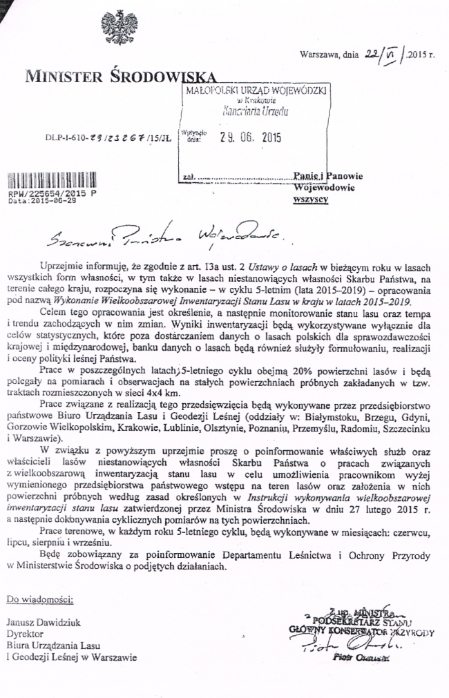 Dotyczące planowanych prac związanych z wykonaniem Wielkoobszarowej Inwestycji Stanu Lasu w kraju w latach 2015-2019. Prace będą polegały na pomiarach i obserwacji na stałych powierzchniach. Celem opracowania jest monitorowanie stanu lasu oraz zachodzących zmian.