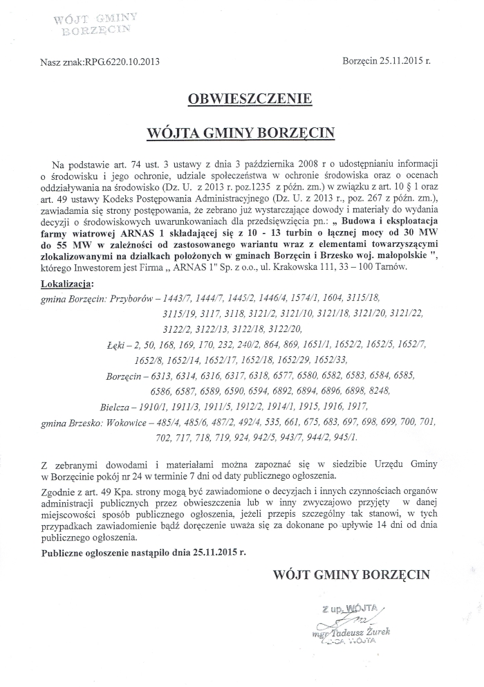 Wójt Gminy Borzęcin że wydano decyzje środowiskowe dla przedsięwzięcia "Budowa i eksploatacja farmy wiatrakowej ARNAS 1 składającej się z 10-13 turbin o łącznej mocy 30-55 MW ".