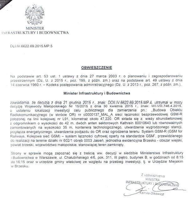 Obwieszczenie Ministra Infrastruktury i Budownictwa o utrzymaniu w mocy decyzji Wojewody Małopolskiego o ustaleniu lokalizacji inwestycji dla zamierzenia pod nazwą: "Budowa obiektu radiokomunikacyjnego" (w skrócie OR).