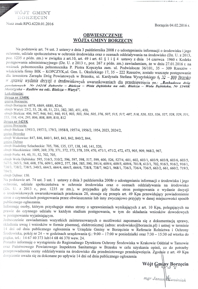 Wójt Gminy Borzęcin zawiadomienie o wszczęciu postępowania w sprawie wydana decyzji o środowiskowych uwarunkowaniach dla przedsięwzięcia pn. Rozbudowa dróg powiatowych Nr 1421K Zaborów – Bielcza – Wola Dębińska.