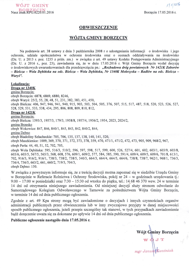 Wójt Gminy Borzęcin wydał decyzję o środowiskowych uwarunkowaniach dla przedsięwzięcia "Rozbudowa dróg powiatowych Nr 1421K Zaborów - Bielcza - Wola Dębińska, Nr 1340K Mokrzyska - Radłów.