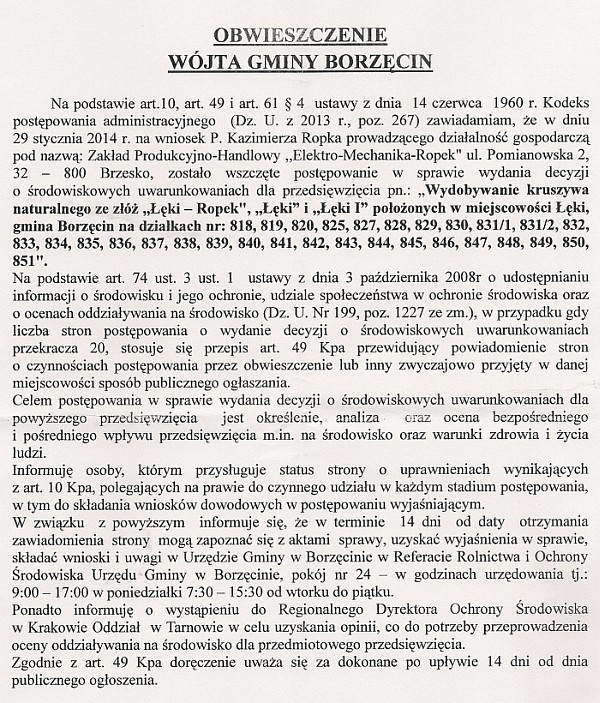 Obwieszczenie Wójta Gminy Borzęcin w sprawie "Wydobywania kruszywa naturalnego ze złóż Łęki -Ropek", położonych w miejscowości Łęki, na terenie gminy Borzęcin. Osobą którym przysługuje status strony mogą zapoznać się z dokumentami w terminie 14 dni.