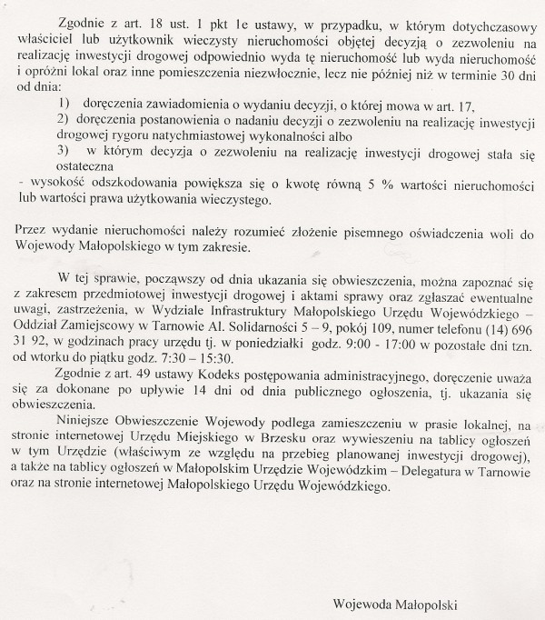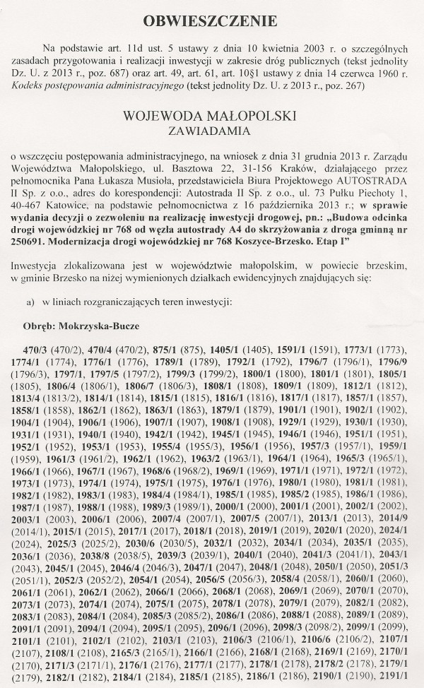 Wojewoda Małopolski zawiadamia o wszczęciu postępowania administracyjnego na wniosek Zarządu Województwa Małopolskiego w sprawie budowy odcinka drogi wojewódzkiej nr 768, łącznika autostrady A4 ze skrzyżowaniem drogi gminnej nr 250691.