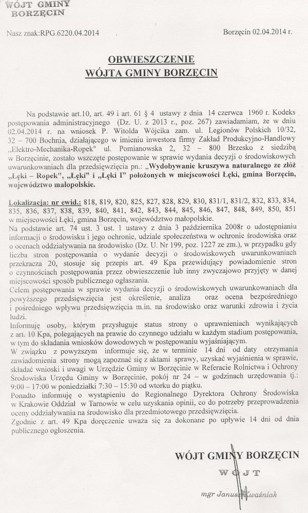 Wójt Gminy Borzęcin obwieszcza, wszczęcie postępowania w sprawie wydania decyzji o środowiskowych uwarunkowaniach dla przedsięwzięcia pn. "Wydobywanie kruszywa naturalnego ze złóż w miejscowości Łęki".
