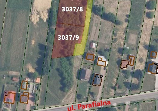 - 3037/10 znajduje się w strefie zainwestowania kubaturowego terenów podmiejskich i wiejskich (ok. 50% pow. działki) oraz w strefie gospodarki rolno-leśnej (ok. 50%