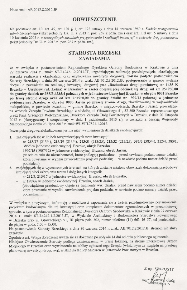 Starosta Brzeski zawiadamia o wszczęciu postępowania w sprawie wydania decyzji na realizację inwestycji drogowej pn. "Rozbudowa drogi powiatowej nr 1435 K Brzesko-Cerekiew, ulica Leśna w Brzesku."